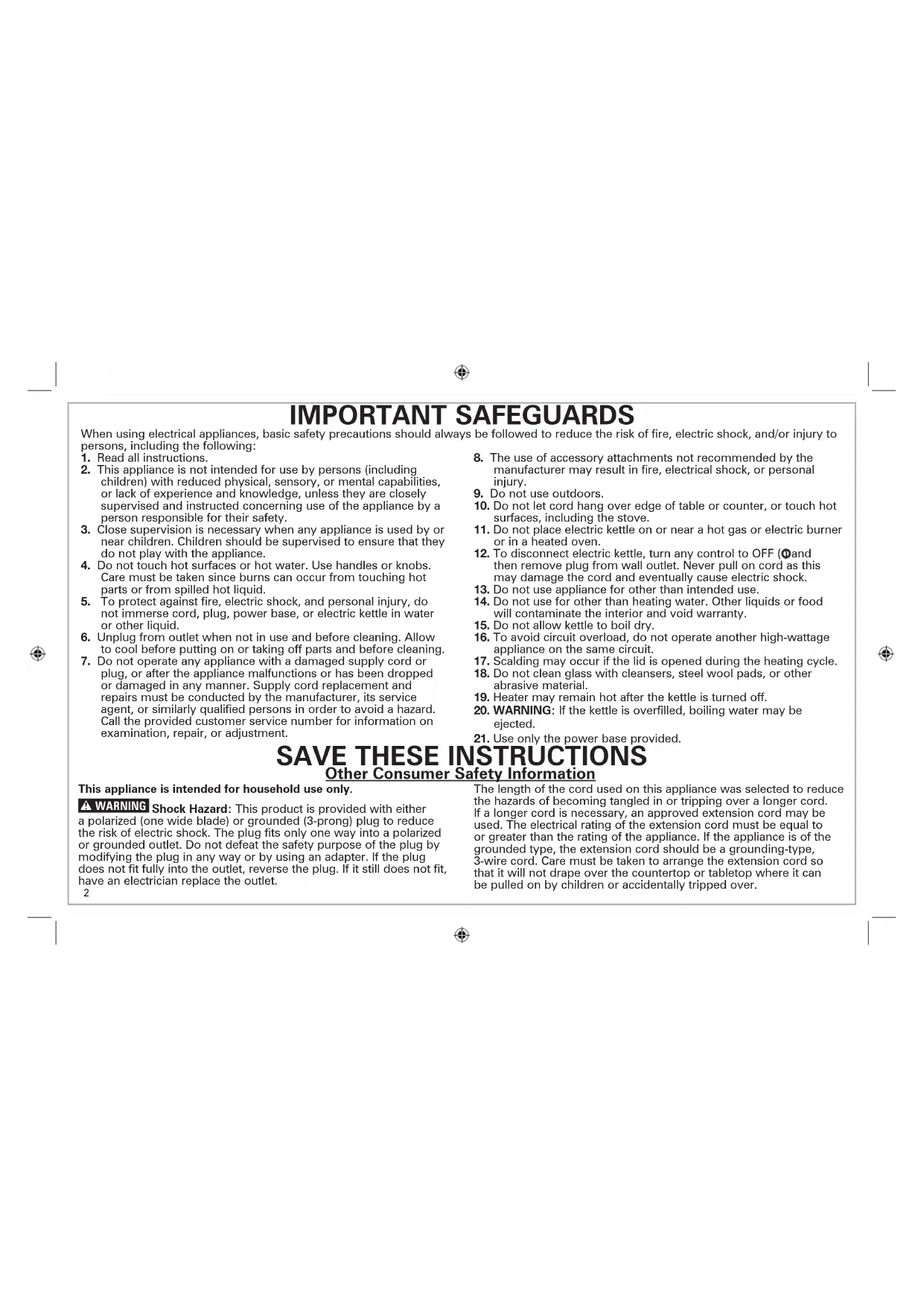 Other Consumer Safety Information This appliance is intended for household use only. w WARNING Shock Hazard: This product is provided with either a polarized (one wide blade) or grounded (3-prong) plug to reduce the risk of electric shock. The plug fits only one way into a polarized or grounded outlet. Do not defeat the safety purpose of the plug by modifying the plug in any way or by using an adapter. If the plug does not fit fully into the outlet, reverse the plug. If it still does not fit, have an electrician replace the outlet. The length of the cord used on this appliance was selected to reduce the hazards of becoming tangled in or tripping over a longer cord. If a longer cord is necessary, an approved extension cord may be used. The electrical rating of the extension cord must be equal to or greater than the rating of the appliance. If the appliance is of the grounded type, the extension cord should be a grounding-type, 3-wire cord. Care must be taken to arrange the extension cord so that it will not drape over the countertop or tabletop where it can be pulled on by children or accidentally tripped over.3 Parts and Features Lid Power Base Power Light (located inside kettle) Power Switch Lid-Opening Button Anti-Scale Mesh Filter4 How to Use the Kettle