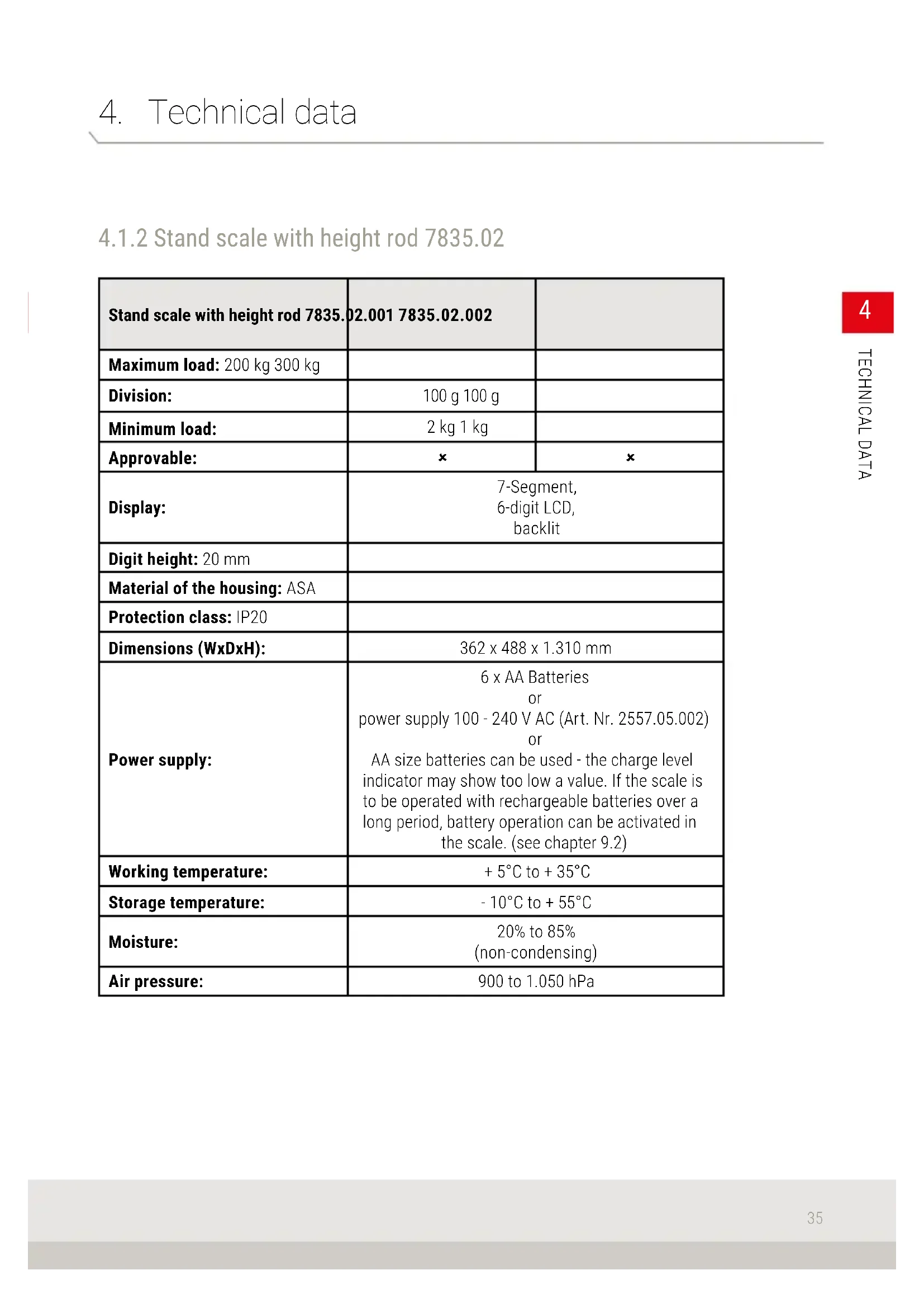 The 7835 stand scales are used to determine the weight of persons. The device measures the weight force on the weighing platform and transmits it electronically to the display. The device does not provide interpretable results, it provides weight values. It is the responsibility of qualied personnel to assess the weights.
