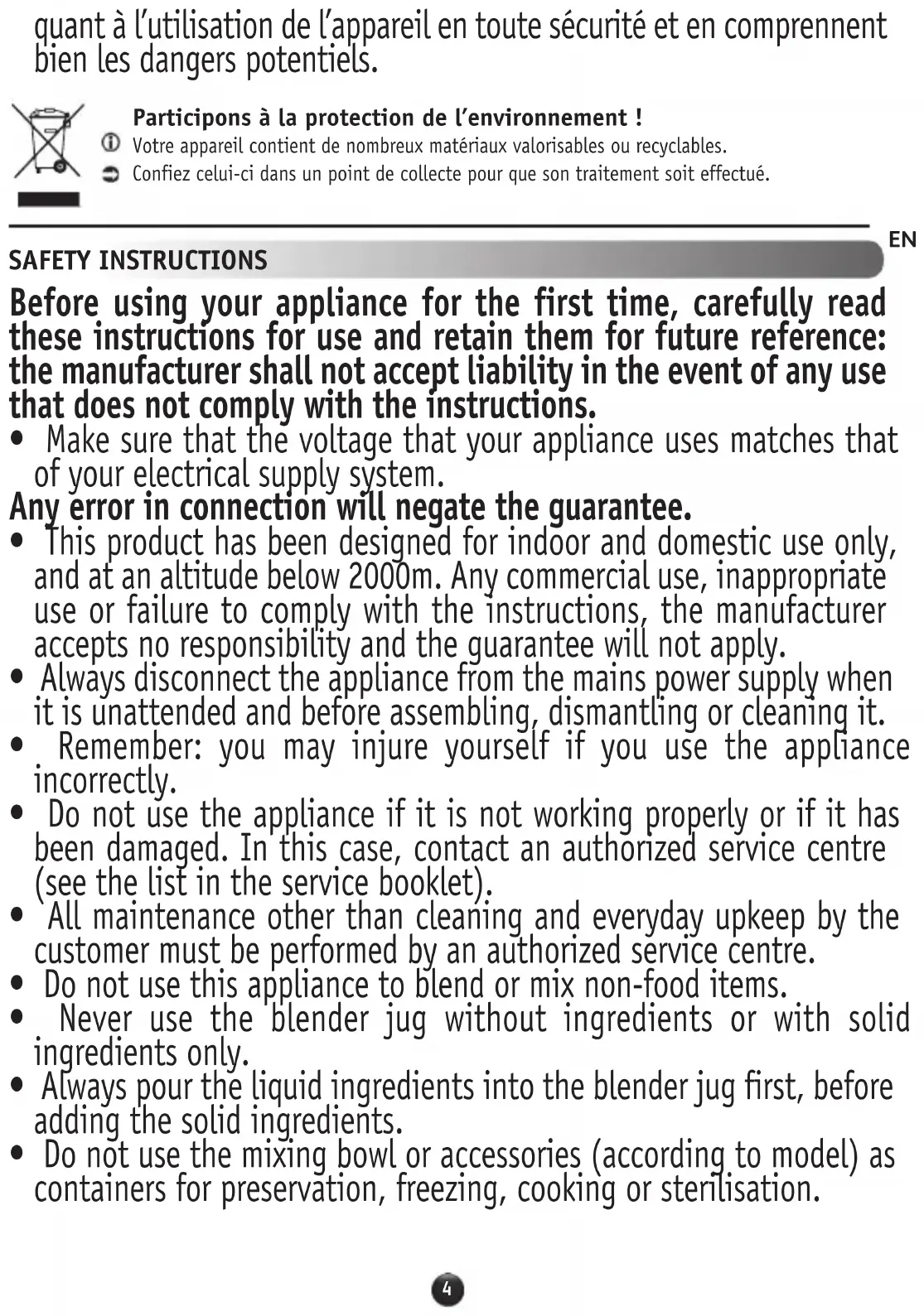 - This product has been designed for indoor and domestic use only, and at an altitude below 2000m. Any commercial use, inappropriate use or failure to comply with the instructions, the manufacturer accepts no responsibility and the guarantee will not apply.