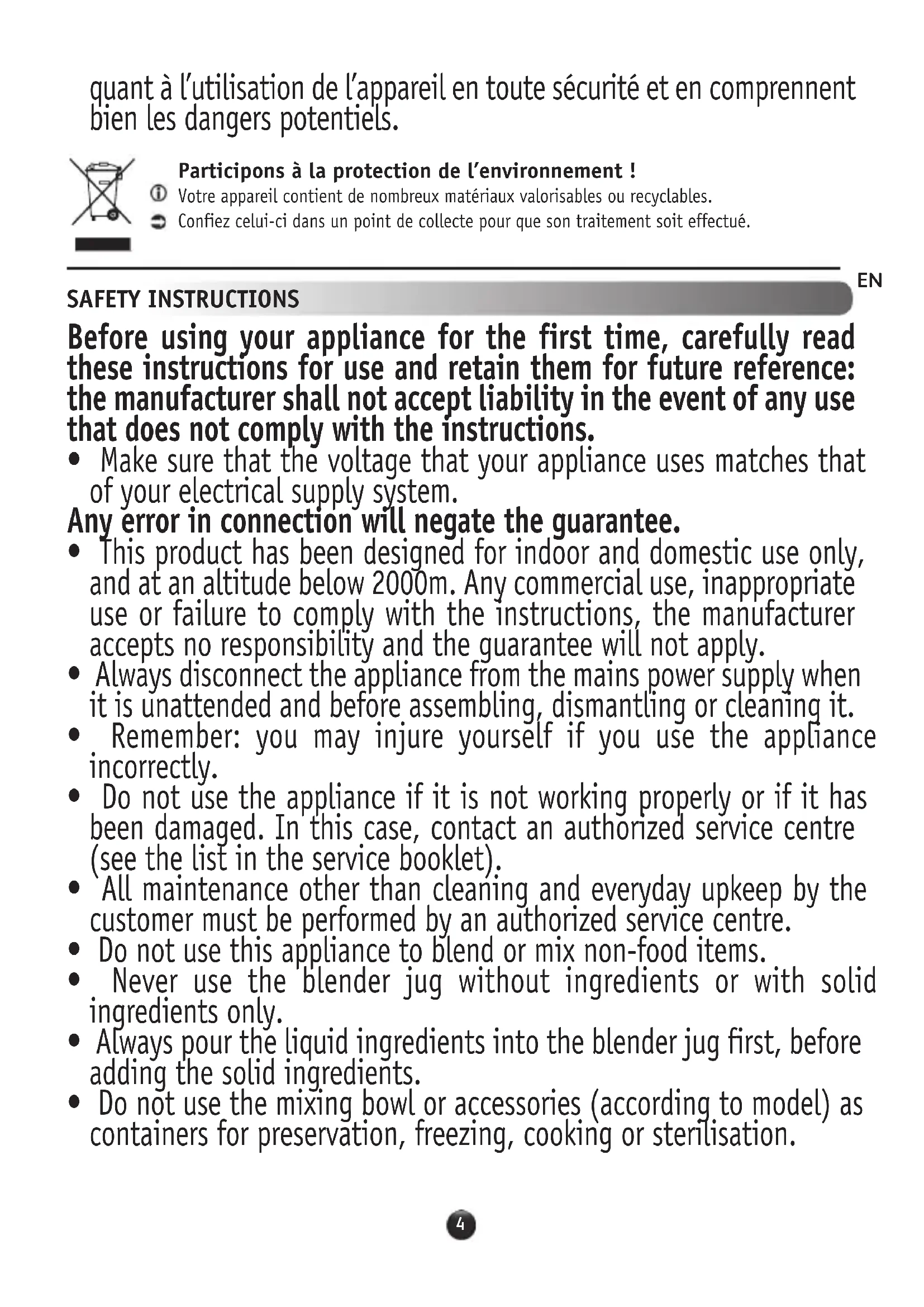 - This product has been designed for indoor and domestic use only, and at an altitude below 2000m. Any commercial use, inappropriate use or failure to comply with the instructions, the manufacturer accepts no responsibility and the guarantee will not apply.