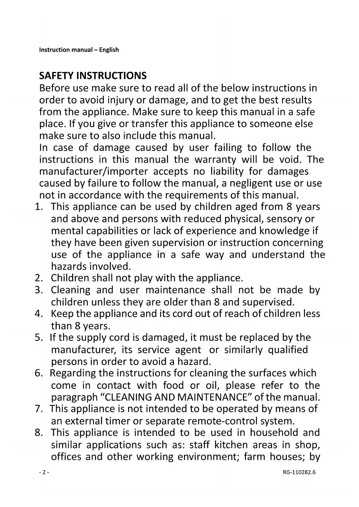 Before delivery our devices are subjected to rigorous quality control. If, despite all care, damage has occurred- 6 - RG-110282.6 during production or transportation, please return the device to your dealer. In addition to statutory legal rights, the purchaser has an option to claim under the terms of the following guarantee: For the purchased device we provide 2 years guarantee, commencing from the day of sale. If you have a defective product, you can directly go back to the point of purchase. Defects which arise due to improper handling of the device and malfunctions due to interventions and repairs by third parties or the fitting of non-original parts are not covered by this guarantee. Always keep your receipt, without the receipt you can’t claim any form of warranty. Damage caused by not following the instruction manual, will lead to a void of warranty, if this results in consequential damages then we will not be liable. Neither can we hold responsible for material damage or personal injury caused by improper use if the instruction manual is not properly executed. Damage to accessories does not mean free replacement of the whole appliance. In such case please contact our service department. Broken glass or breakage of plastic parts is always subject to a charge. Defects to consumables or parts subjected to wearing, as well as cleaning, maintenance, replacement of said parts or shipping and transportation costs to and from any place of repair are not covered by the warranty and are to be paid.