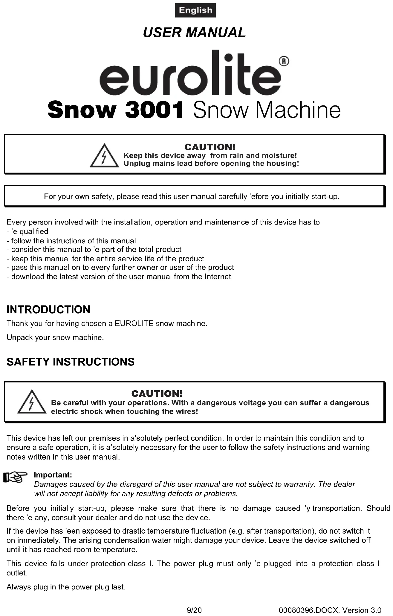For your own safety, please read this user manual carefully before you initially start-up. Every person involved with the installation, operation and maintenance of this device has to - be qualified - follow the instructions of this manual - consider this manual to be part of the total product - keep this manual for the entire service life of the product - pass this manual on to every further owner or user of the product - download the latest version of the user manual from the Internet INTRODUCTION Thank you for having chosen a EUROLITE snow machine. Unpack your snow machine. SAFETY INSTRUCTIONS