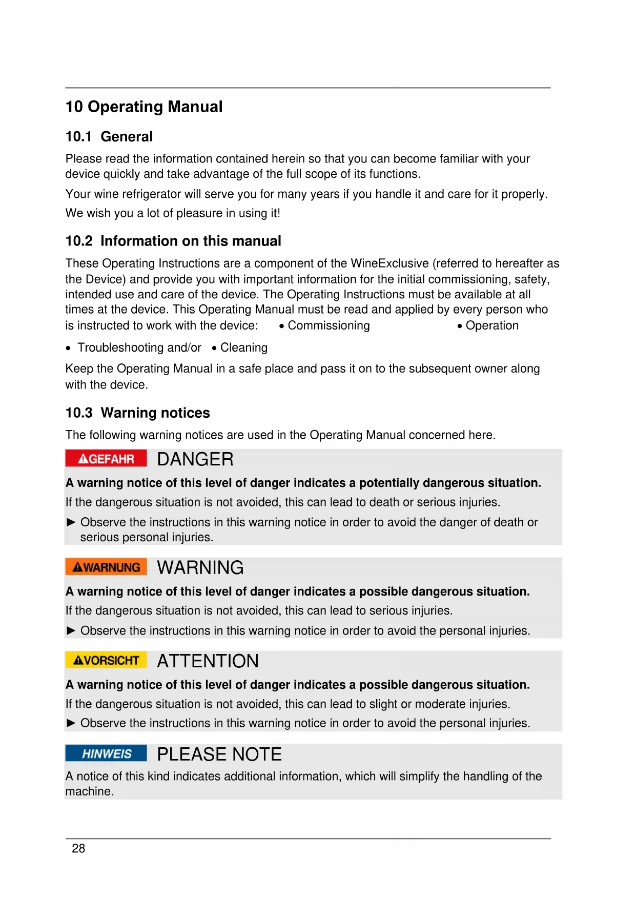 These Operating Instructions are a component of the WineExclusive (referred to hereafter as the Device) and provide you with important information for the initial commissioning, safety, intended use and care of the device. The Operating Instructions must be available at all times at the device. This Operating Manual must be read and applied by every person who is instructed to work with the device: • Commissioning • Operation