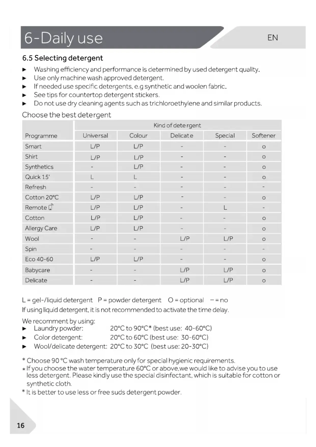 WARNING! Daily use ▶ Do not remove or insert the plug in the presence of flammable gas. ▶ Do not hot wash foam rubber or sponge-like materials. ▶ Do not wash any laundry which is polluted with flour. ▶ Do not open detergent drawer during any wash cycle. ▶ Do not touch the door during the washing process, it gets hot. ▶ Do not open the door if the water level is visibly over the porthole. ▶ Do not force the door to open. The door is tted with a self-lock device and will open shortly after the washing procedure is ended.