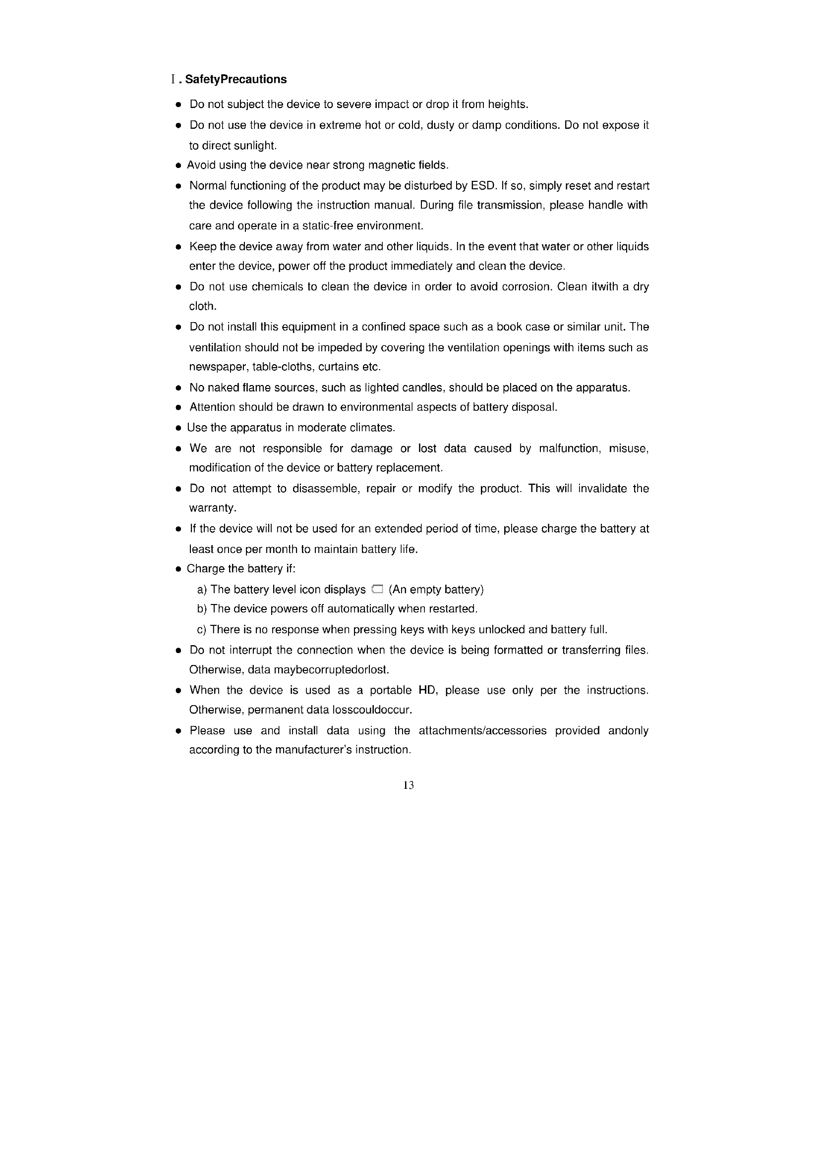 . SafetyPrecautions z Do not subject the device to severe impact or drop it from heights. z Do not use the device in extreme hot or cold, dusty or damp conditions. Do not expose it to direct sunlight. z Avoid using the device near strong magnetic fields. z Normal functioning of the product may be disturbed by ESD. If so, simply reset and restart the device following the instruction manual. During file transmission, please handle with care and operate in a static-free environment. z Keep the device away from water and other liquids. In the event that water or other liquids enter the device, power off the product immediately and clean the device. z Do not use chemicals to clean the device in order to avoid corrosion. Clean itwith a dry cloth. z Do not install this equipment in a confined space such as a book case or similar unit. The ventilation should not be impeded by covering the ventilation openings with items such as newspaper, table-cloths, curtains etc. z No naked flame sources, such as lighted candles, should be placed on the apparatus. z Attention should be drawn to environmental aspects of battery disposal. z Use the apparatus in moderate climates. z We are not responsible for damage or lost data caused by malfunction, misuse, modification of the device or battery replacement. z Do not attempt to disassemble, repair or modify the product. This will invalidate the warranty. z If the device will not be used for an extended period of time, please charge the battery at least once per month to maintain battery life. z Charge the battery if: a) The battery level icon displays (An empty battery) b) The device powers off automatically when restarted. c) There is no response when pressing keys with keys unlocked and battery full. z Do not interrupt the connection when the device is being formatted or transferring files. Otherwise, data maybecorruptedorlost. z When the device is used as a portable HD, please use only per the instructions. Otherwise, permanent data losscouldoccur. z Please use and install data using the attachments/accessories provided andonly according to the manufacturer’s instruction.14 z Please refer to the information on the bottom of the device for electrical and safety information before installing data or operating the device. z To reduce the risk of fire or electric shock, do not expose this device to rain or moisture. The device should not be exposed to dripping or splashing. Never place objects filled with liquids, such as vases, on the device. z There is danger of explosion if the battery is replaced incorrectly. Replace onlywith the same or equivalent type. z The battery (battery or batteries or battery pack) should not be exposed to excessive heat such as sunlight, fire or the like. z Please follow responsible procedures for battery disposal. z If the power adaptor disconnected from the device, the device will remain operable as long as the battery has sufficient charge. z The power adaptor is a CLASS II apparatus with double insulation, and no external ground is provided. Listening Cautions z This product respects the current regulations for limiting the output volume of consumer audio devices to a safe level. By listening to your device with headphones or earbuds at high volumes, you run the risk of permanent damage to your ears. Even if you get used to listening at high volumes and it seems normal to you, you still risk the possibility of damaging your hearing. Reduce the volume of your device to a reasonable level to avoid permanent hearing damage. If you hear ringing in your ears, reduce the volume or shut off your device. This device has been tested with the supplied earphones. In order to preserve your hearing, it is advised that you use only the following headphone models: the earphones supplied with your device, or any other headphones that respect the current regulations. Other types of headphones may produce higher volume levels.ాAt full power ,the prolonged listening of the walkman can damage the ear of the useి z Do not use while operating a motorized vehicle. It may create a traffic hazard and is illegal in many areas. z You should use extreme caution or temporarily discontinue use in potentially hazardous situations created by obstructed hearing. z Even if your headphones or earphones are the open-air type designed to let you hear outside sounds, don’t turn up the volume so high that you can’t hear what’s around you. z Sound can be deceiving. Over time your hearing “comfort level” adapts to higher volumes of sound. What sounds “normal” can actually be loud and harmful to your hearing. Guard15 against this by setting the volume of your deviceat a safe level BEFORE your hearing adapts. To establish a safe volume level: b. Start your volume control at a low setting. c. Slowly increase the sound until you can hear it comfortably and clearly, and without distortion. Once you have established a comfortable sound level, leave it there. WEEE and CE Information Information about the meaning of Logo WEEE (Waste Electrical and Electronic Equipment): The WEEE logo on the product or on its box indicates that this product must not be disposed of or dumped with your other household waste. You are liable to dispose of all your electronic or electrical waste equipment by relocating over to the specified collection point for recycling of such hazardous waste. Isolated collection and proper recovery of your electronic and electrical waste equipment at the time of disposal will allow us to help conserving natural resources. Moreover, proper recycling of the electronic and electrical waste equipment will ensure safety of human health and environment. Dispose of electronic waste, such as batteries according to the instructions. Caution: risk of explosion if battery is replaced by an incorrect type. For pluggable equipment, the socket-outlet shall be installed near the equipment and shall be easily accessible. Information about the meaning of marki