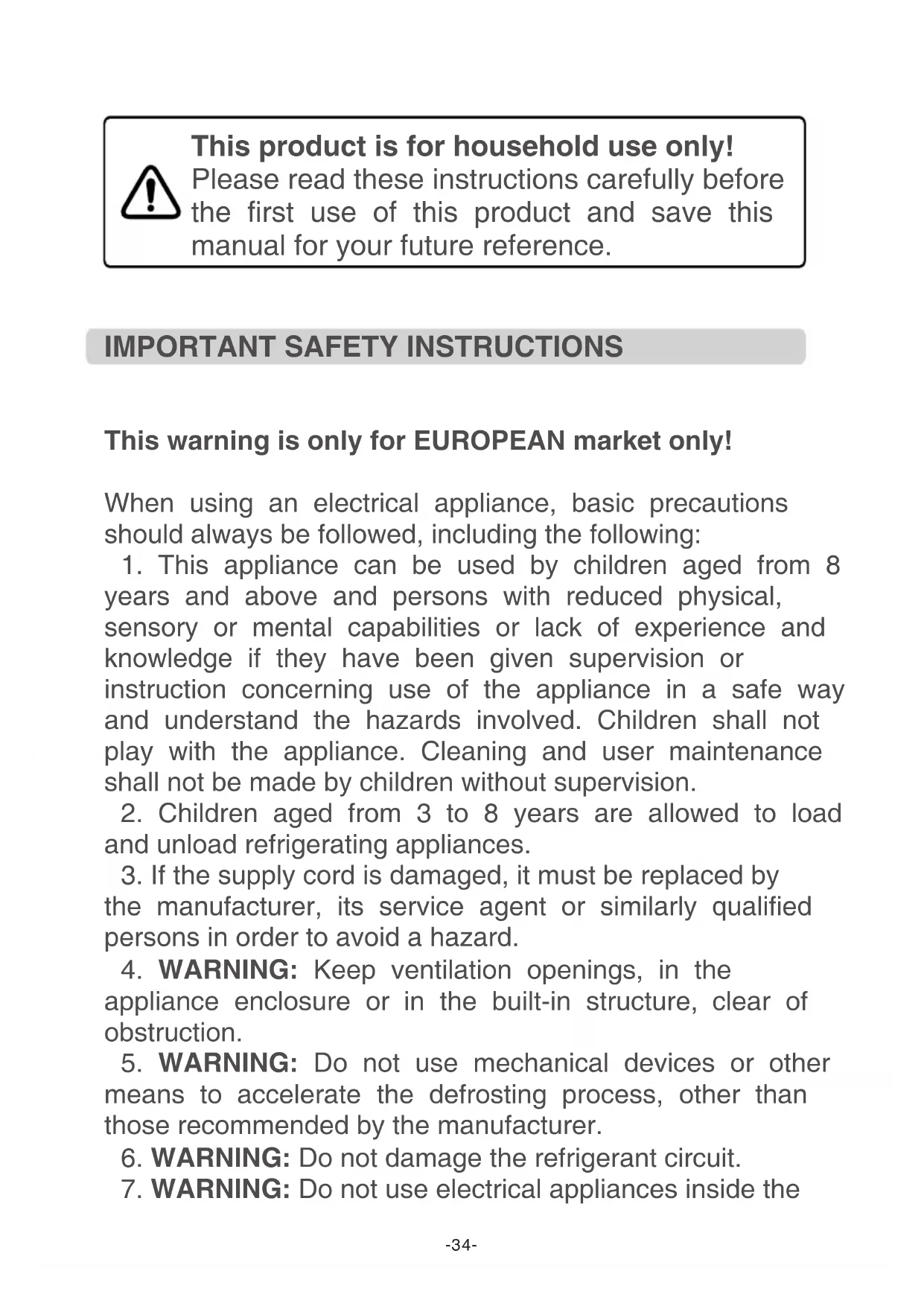 This warning is only for EUROPEAN market only! When using an electrical appliance, basic precautions should always be followed, including the following: