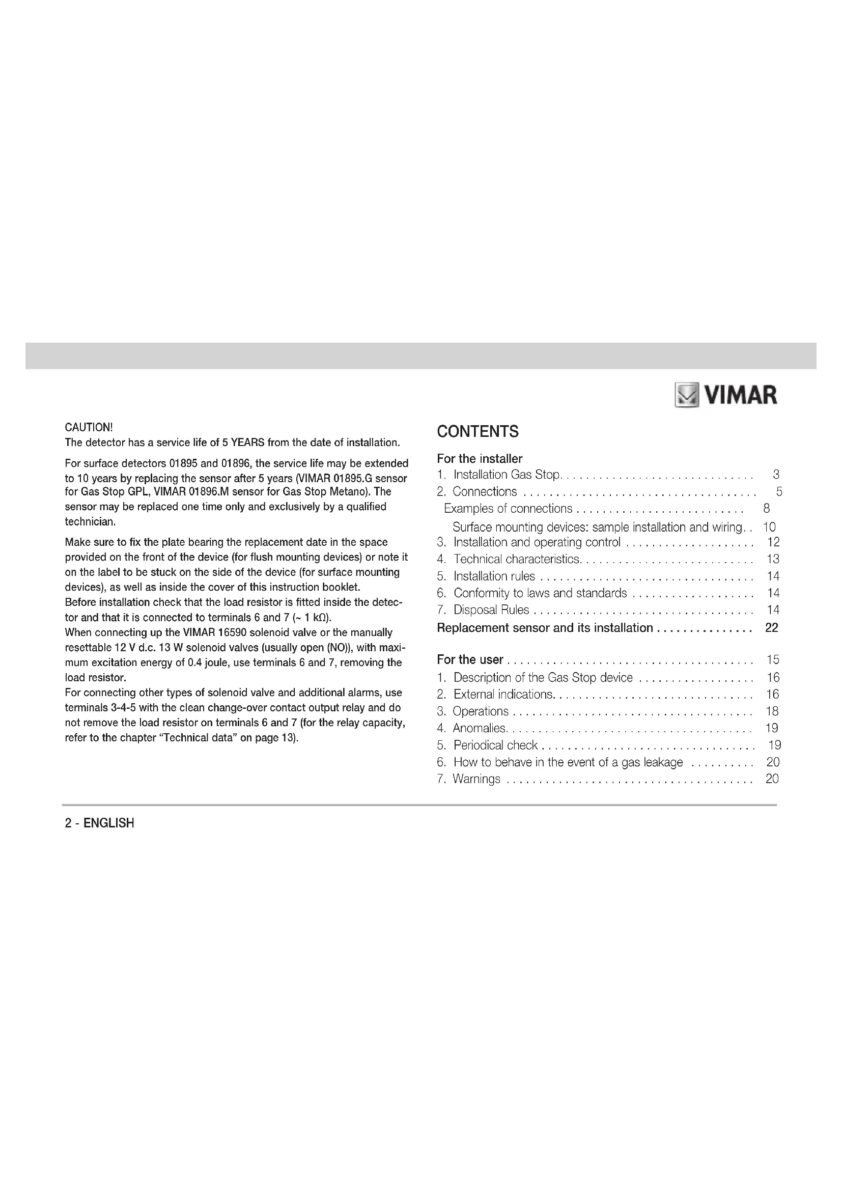 CAUTION! The detector has a service life of 5 YEARS from the date of installation. For surface detectors 01895 and 01896, the service life may be extended to 10 years by replacing the sensor after 5 years (VIMAR 01895.G sensor for Gas Stop GPL, VIMAR 01896.M sensor for Gas Stop Metano). The sensor may be replaced one time only and exclusively by a qualified technician. Make sure to fix the plate bearing the replacement date in the space provided on the front of the device (for flush mounting devices) or note it on the label to be stuck on the side of the device (for surface mounting devices), as well as inside the cover of this instruction booklet. Before installation check that the load resistor is fitted inside the detec- tor and that it is connected to terminals 6 and 7 (~ 1 kΩ). When connecting up the VIMAR 16590 solenoid valve or the manually resettable 12 V d.c. 13 W solenoid valves (usually open (NO)), with maxi- mum excitation energy of 0.4 joule, use terminals 6 and 7, removing the load resistor. For connecting other types of solenoid valve and additional alarms, use terminals 3-4-5 with the clean change-over contact output relay and do not remove the load resistor on terminals 6 and 7 (for the relay capacity, refer to the chapter “Technical data” on page 13).ENGLISH - 3