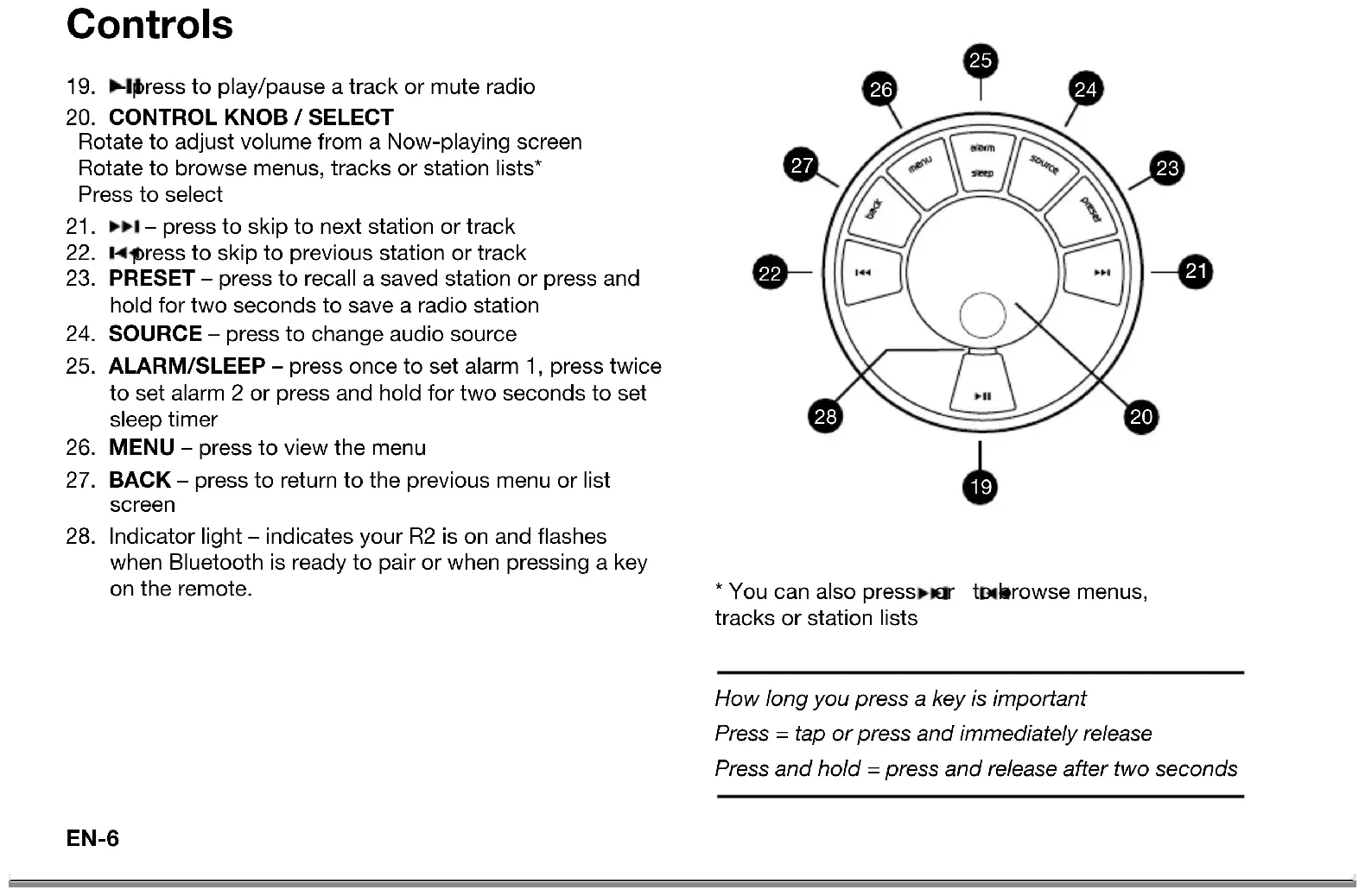 - You can also press or to browse menus, tracks or station lists How long you press a key is important Press = tap or press and immediately release Press and hold = press and release after two secondsEN-7