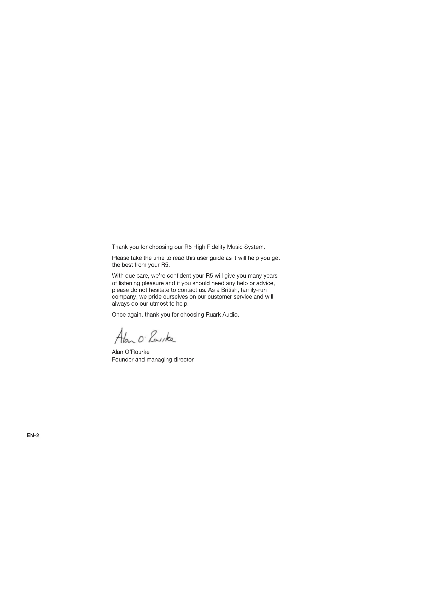 R5 High Fidelity Music System User guideEN-2 Thank you for choosing our R5 High Fidelity Music System. Please take the time to read this user guide as it will help you get the best from your R5. With due care, we’re condent your R5 will give you many years of listening pleasure and if you should need any help or advice, please do not hesitate to contact us. As a British, family-run company, we pride ourselves on our customer service and will always do our utmost to help. Once again, thank you for choosing Ruark Audio. Alan O’Rourke Founder and managing directorEN-3