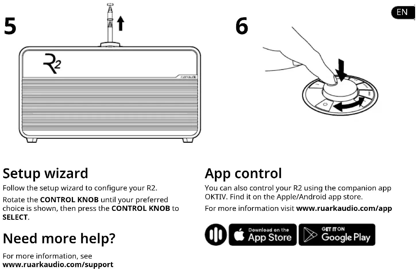 Setup wizard Follow the setup wizard to congure your R2. Rotate the CONTROL KNOB until your preferred choice is shown, then press the CONTROL KNOB to SELECT. Need more help? For more information, see www.ruarkaudio.com/support App control You can also control your R2 using the companion app OKTIV. Find it on the Apple/Android app store. For more information visit www.ruarkaudio.com/appControls