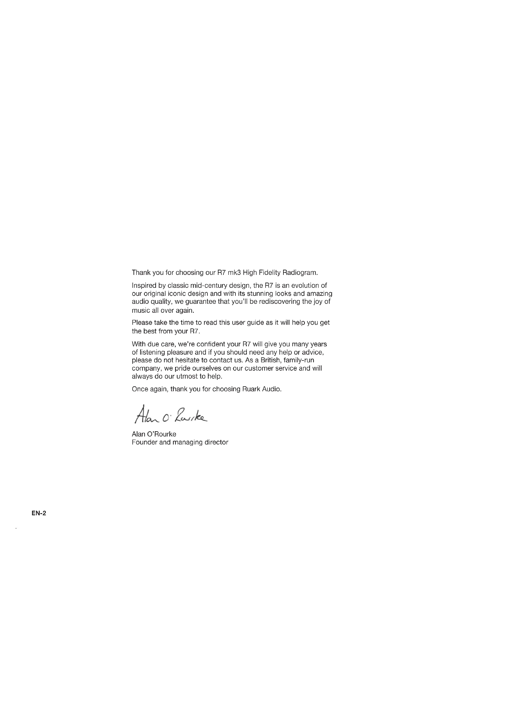 R7 mk3 High Fidelity Radiogram User guideEN-2 Thank you for choosing our R7 mk3 High Fidelity Radiogram. Inspired by classic mid-century design, the R7 is an evolution of our original iconic design and with its stunning looks and amazing audio quality, we guarantee that you’ll be rediscovering the joy of music all over again. Please take the time to read this user guide as it will help you get the best from your R7. With due care, we’re condent your R7 will give you many years of listening pleasure and if you should need any help or advice, please do not hesitate to contact us. As a British, family-run company, we pride ourselves on our customer service and will always do our utmost to help. Once again, thank you for choosing Ruark Audio. Alan O’Rourke Founder and managing directorEN-3