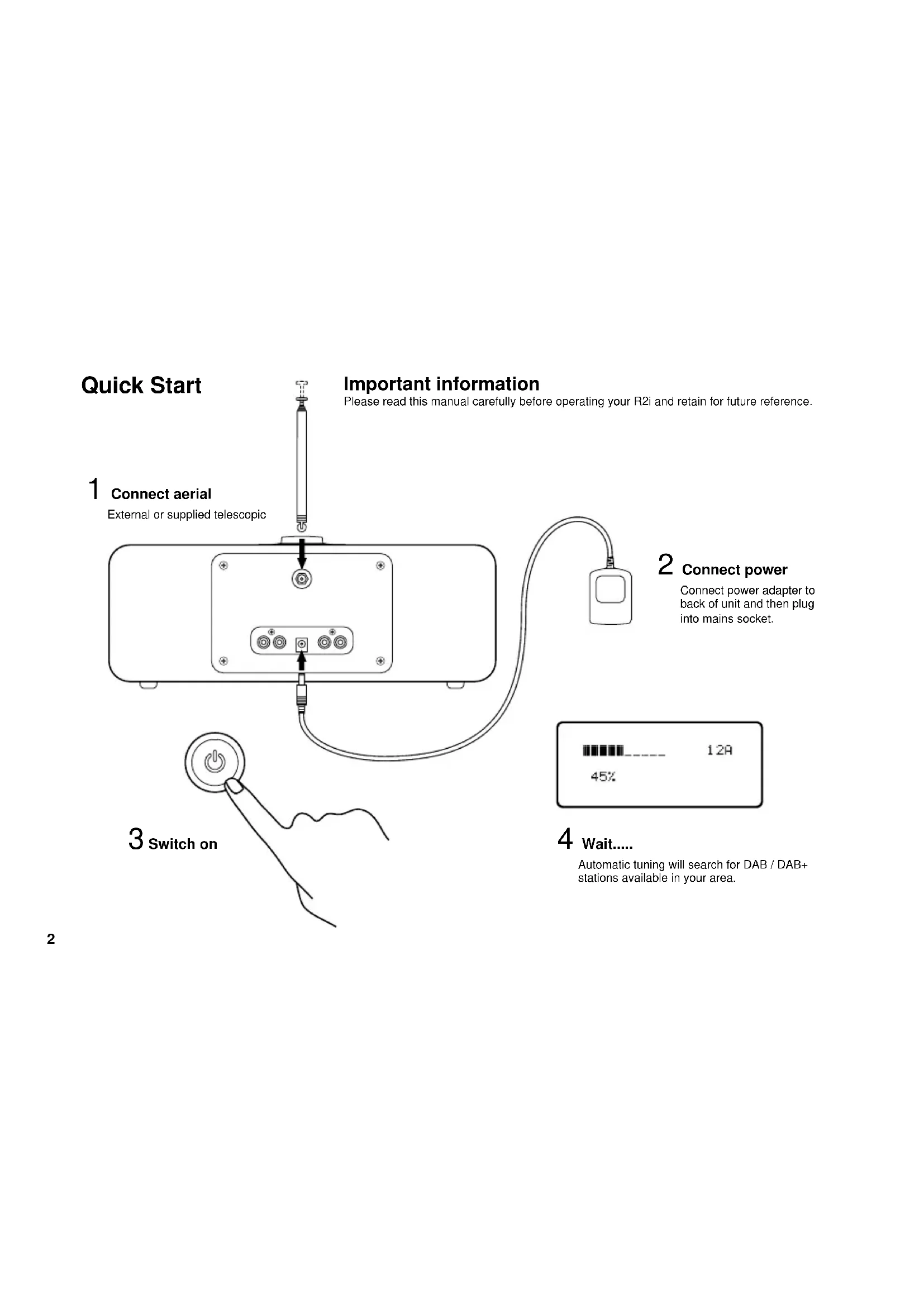 Specifications ● DAB & DAB+ compatible stereo tuner ● FM Stereo Tuner 87.5 – 108 MHz with RDS ● Universal iPod Dock supports all current iPod (30-pin) models produced from January 2004 onwards ● 3.5mm headphone output on front panel ● RCA fixed phono outputs on rear panel ● 2 x 3.5” custom full range speaker units ● 2 x 10w nominal power output ● Aerial: removable telescopic with F-type connector ● Dimensions: H120 x W340 x D185mm (4.75 x 13.5 x 7.25 ins) ● Weight: 3.5 kg (7.7 lbs) R2i Power supply ● Input power 100V to 240VAC 50-60Hz 0.5A ● Output power 12VDC 2.0AUser guide Guide de l’utilisateur Bedienungsanleitung Manuale utente Manual de instrucciones Brukerveiledning Gebruikershandleiding