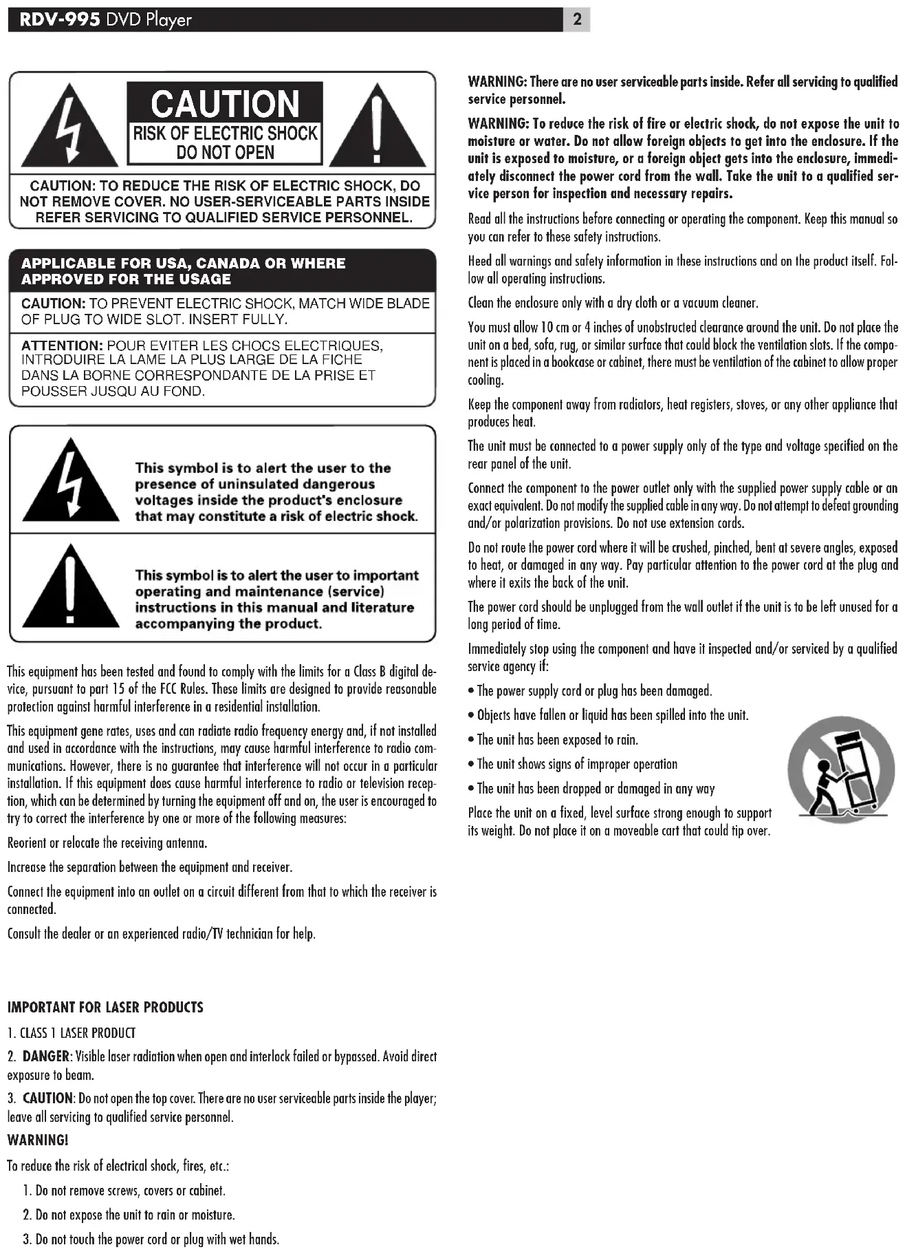 - Specifications and appearance subject to change without prior notice. Rotel and the Rotel HiFi logo are registered trademarks of The Rotel Co, Ltd., Tokyo , Japan. DTS is a registered trademark of Digital Theater Systems. Manufactured under license from Dolby Laboratories Licensing Corporation. “Dolby” and the double-D symbol are trademarks of Dolby Laboratories Licensing Corporation. Confidential unpublished works © 1992 –1997 Dolby Laboratories, Inc. All rights reserved. English30 RDV-995 Lecteur de DVD IMPORTANT␣ : APPAREIL INTÉGRANT UNE TÊTE DE LECTURE LASER