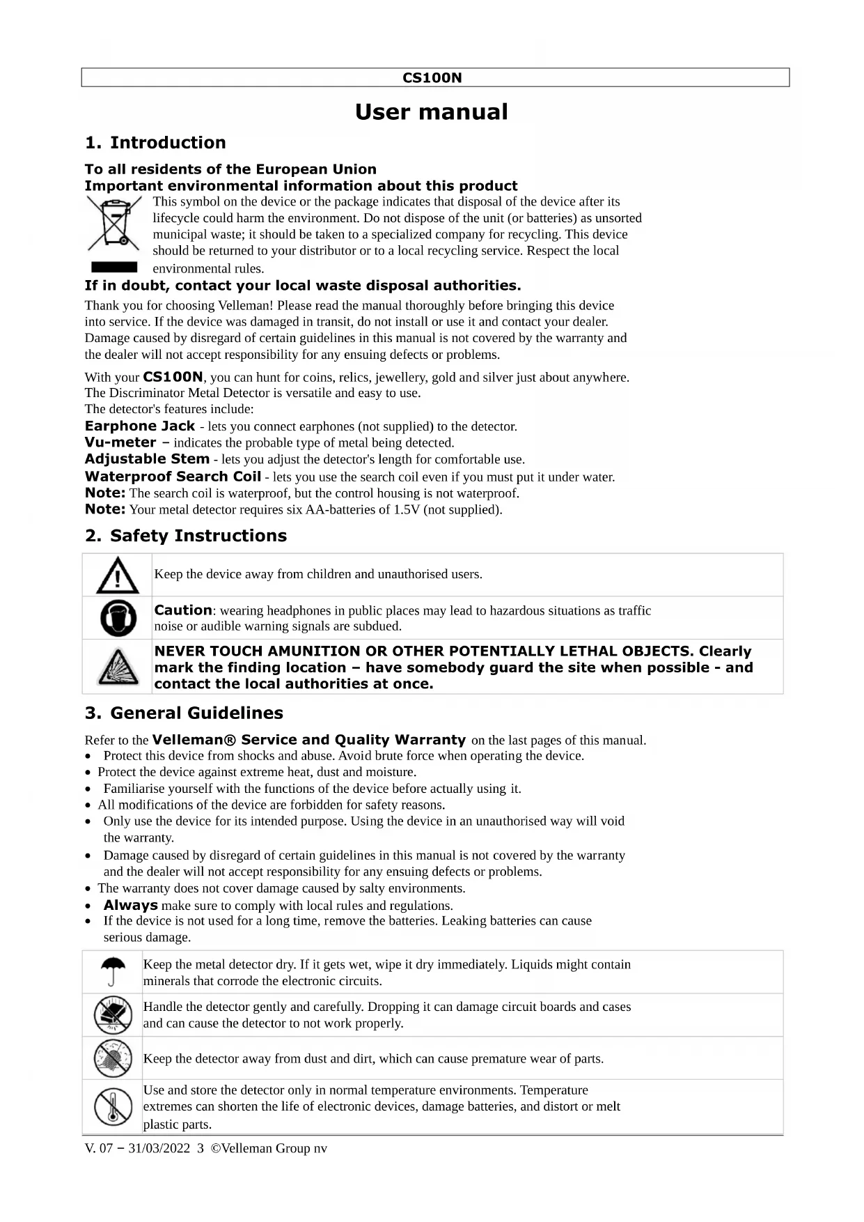To all residents of the European Union Important environmental information about this product This symbol on the device or the package indicates that disposal of the device after its lifecycle could harm the environment. Do not dispose of the unit (or batteries) as unsorted municipal waste; it should be taken to a specialized company for recycling. This device should be returned to your distributor or to a local recycling service. Respect the local environmental rules. If in doubt, contact your local waste disposal authorities. Thank you for choosing Velleman! Please read the manual thoroughly before bringing this device into service. If the device was damaged in transit, do not install or use it and contact your dealer. Damage caused by disregard of certain guidelines in this manual is not covered by the warranty and the dealer will not accept responsibility for any ensuing defects or problems. With your CS100N, you can hunt for coins, relics, jewellery, gold and silver just about anywhere. The Discriminator Metal Detector is versatile and easy to use. The detector's features include: Earphone Jack - lets you connect earphones (not supplied) to the detector. Vu-meter – indicates the probable type of metal being detected. Adjustable Stem - lets you adjust the detector's length for comfortable use. Waterproof Search Coil - lets you use the search coil even if you must put it under water. Note: The search coil is waterproof, but the control housing is not waterproof. Note: Your metal detector requires six AA-batteries of 1.5V (not supplied).