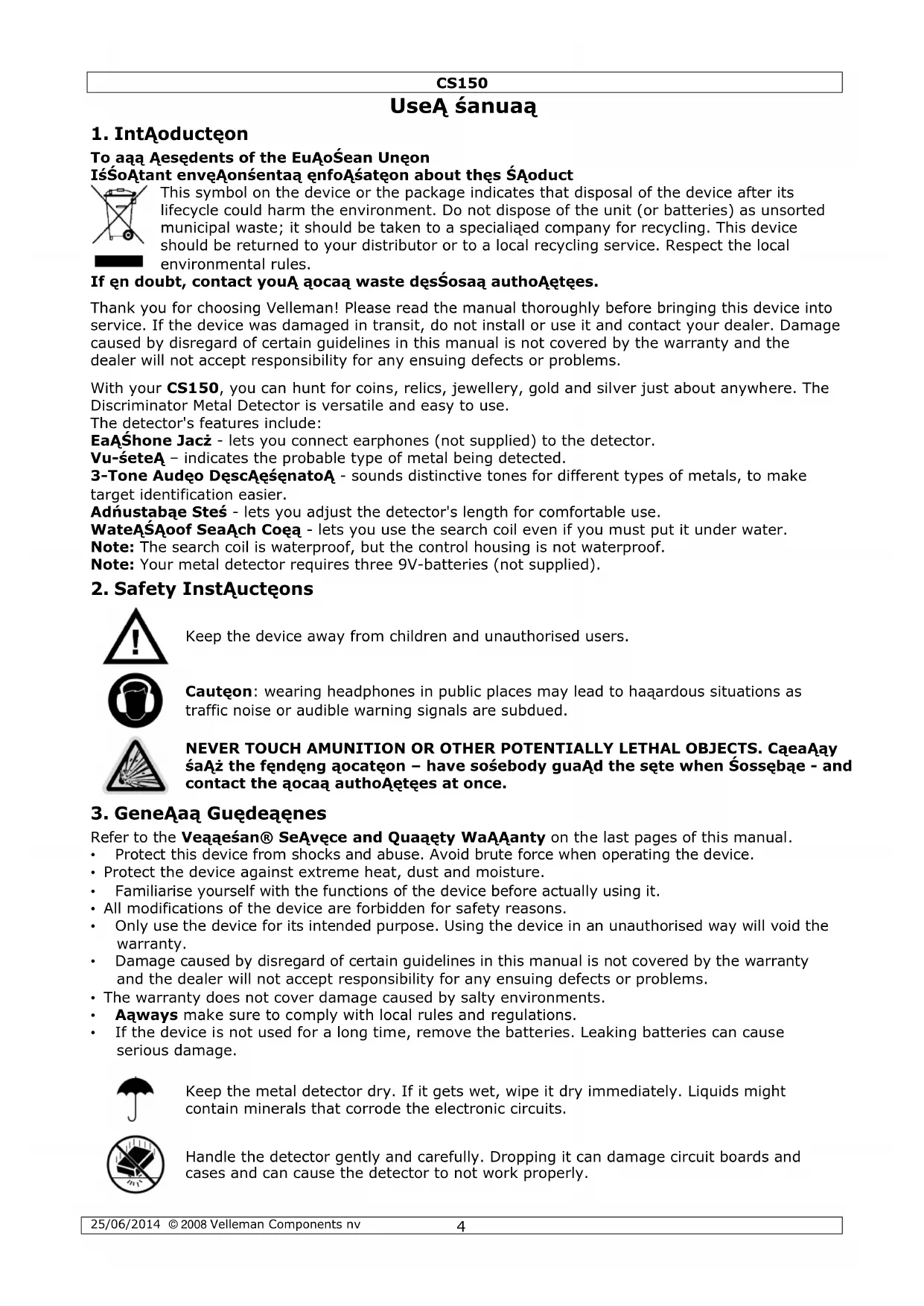 Handle the detector gently and carefully. Dropping it can damage circuit boards and cases and can cause the detector to not work properly.CS150 25/06/2014 © 2008 Velleman Components nv