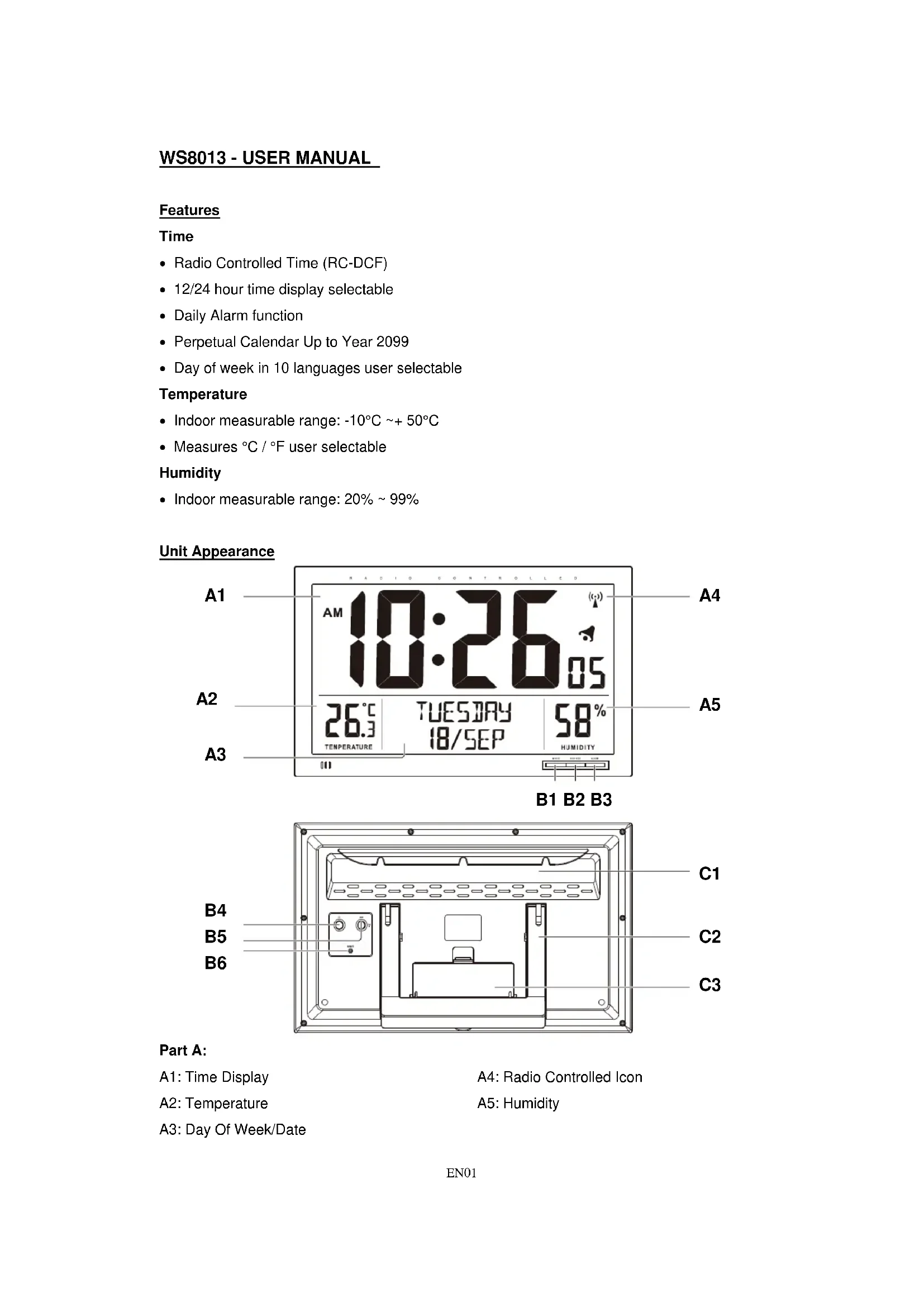 Features Time Radio Controlled Time (RC-DCF) 12/24 hour time display selectable Daily Alarm function Perpetual Calendar Up to Year 2099 Day of week in 10 languages user selectable Temperature Indoor measurable range: -10°C ~+ 50°C Measures °C / °F user selectable Humidity Indoor measurable range: 20% ~ 99% Unit Appearance Part A: A1: Time Display A2: Temperature A3: Day Of Week/Date A4: Radio Controlled Icon A5: Humidity