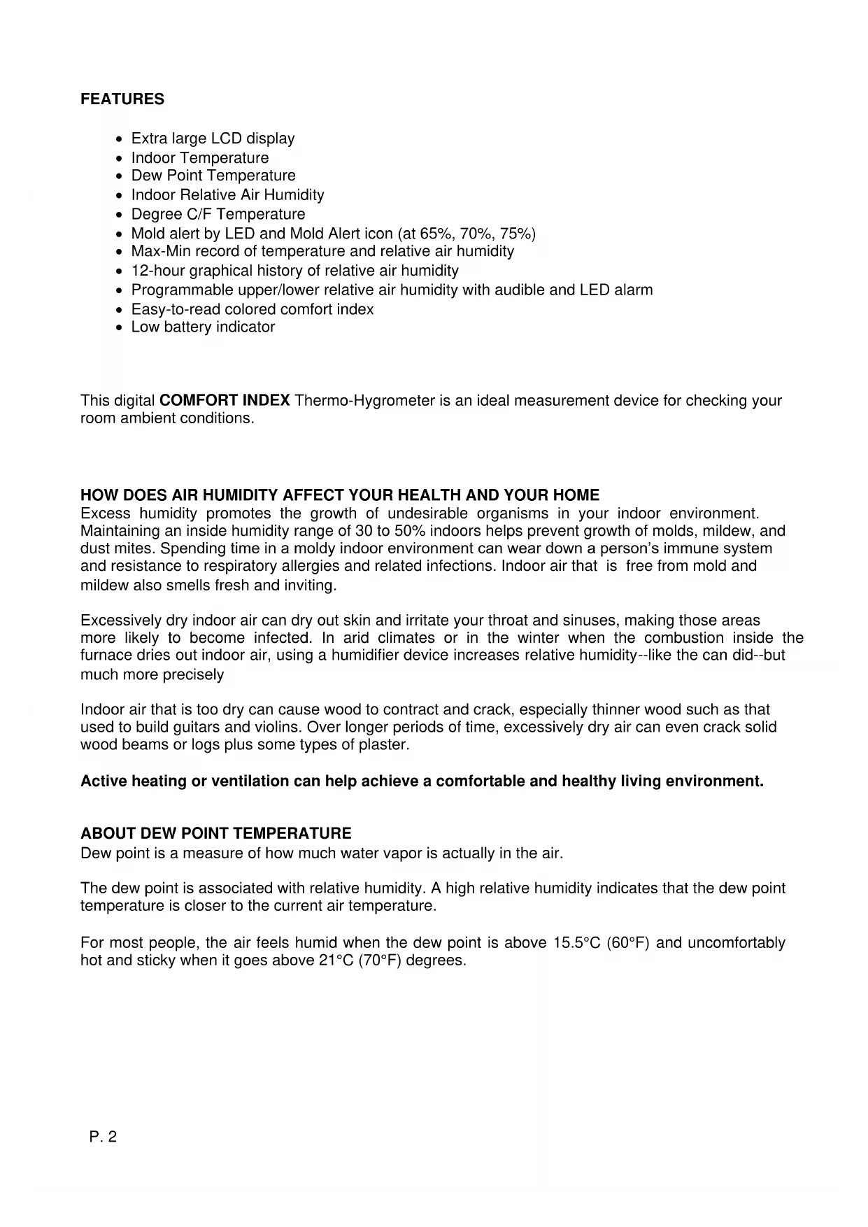 12-HOUR GRAPHICAL HISTORY OF RELATIVE AIR HUMIDITY You could easily view the comfort level of your room conditions in accordance with the last 12-hour relative humidity records. COMFORT LEVEL RELATIVE HUMIDITY TOO WET 81% to 90% WET 61% to 80% COMFORT 41% to 60% DRY 31% to 40% TOO DRY 20% to 30%P. 4