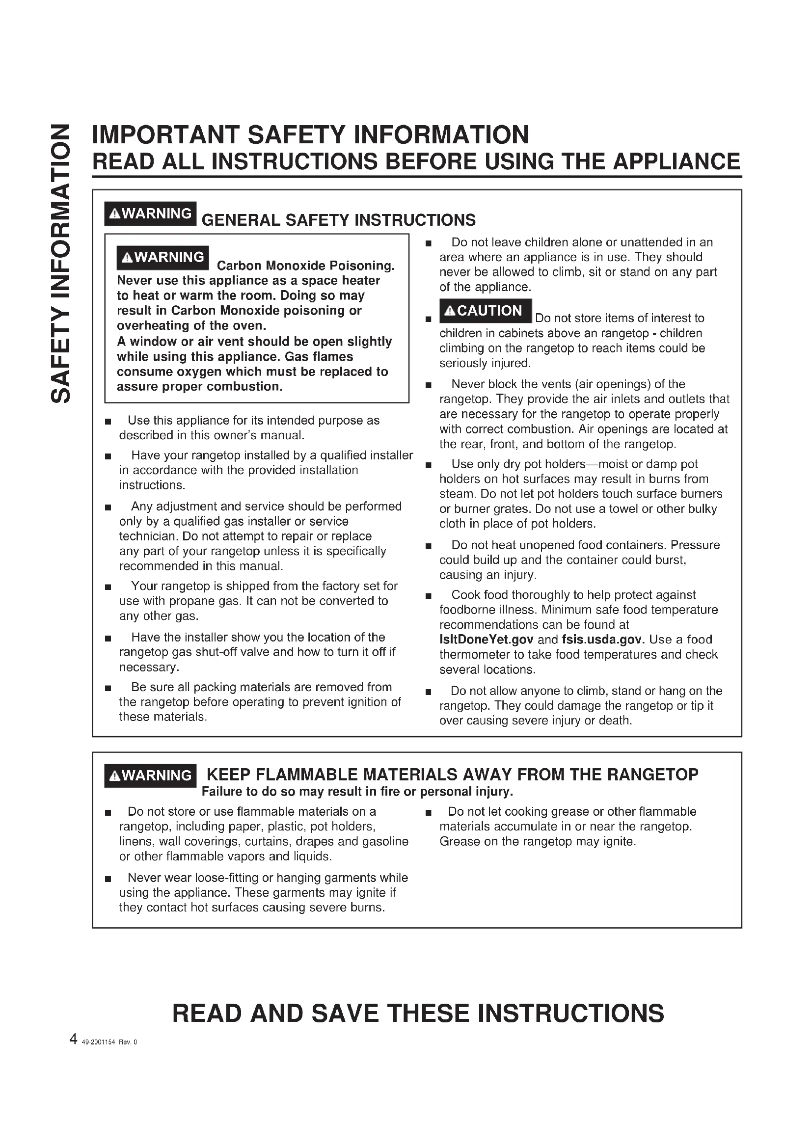 service agency, manufacturer, dealer or the gas supplier. WARNING Read all safety instructions before using the product. Failure to follow these instructions may result in fire, electrical shock, serious injury or death.4 49-2001154 Rev. 0 WARNING KEEP FLAMMABLE MATERIALS AWAY FROM THE RANGETOP Failure to do so may result in fire or personal injury.Ŷ 'RQRWVWRUHRUXVHIODPPDEOHPDWHULDOVRQDrangetop, including paper, plastic, pot holders, linens, wall coverings, curtains, drapes and gasoline or other flammable vapors and liquids.Ŷ 1HYHUZHDUORRVHILWWLQJRUKDQJLQJJDUPHQWVZKLOHusing the appliance. These garments may ignite if they contact hot surfaces causing severe burns.Ŷ 'RQRWOHWFRRNLQJJUHDVHRURWKHUIODPPDEOHmaterials accumulate in or near the rangetop. Grease on the rangetop may ignite. SAFETY INFORMATION