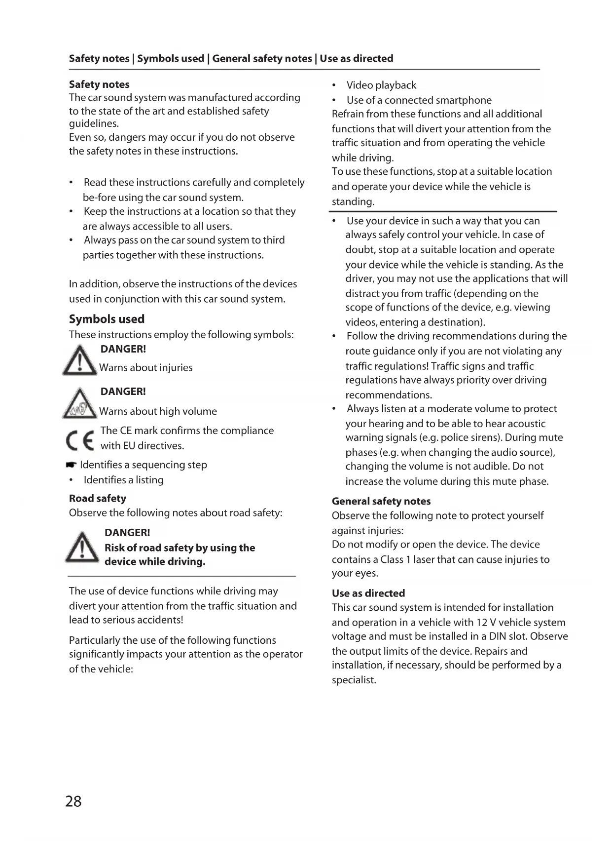 ENGLISH 27Safety notes | Symbols used | General safety notes | Use as directed Safety notes The car sound system was manufactured according to the state of the art and established safety guidelines. Even so, dangers may occur if you do not observe the safety notes in these instructions.