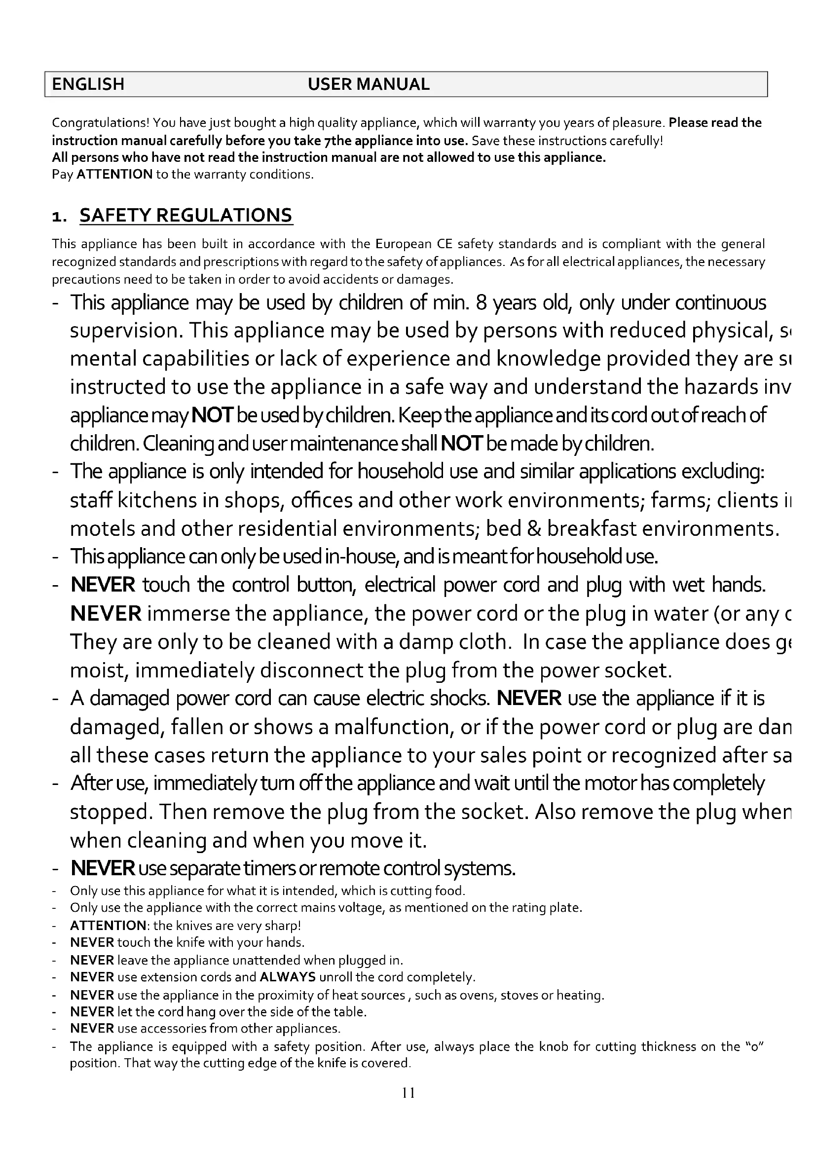 This appliance has been built in accordance with the European CE safety standards and is compliant with the general recognized standards and prescriptions with regard to the safety of appliances. As for all electrical appliances, the necessary precautions need to be taken in order to avoid accidents or damages. - This appliance may be used by children of min. 8 years old, only under continuous supervision. This appliance may be used by persons with reduced physical, sensory or mental capabilities or lack of experience and knowledge provided they are supervised or instructed to use the appliance in a safe way and understand the hazards involved. This appliance may NOT be used by children. Keep the appliance and its cord out of reach of children. Cleaning and user maintenance shall NOT be made by children. - The appliance is only intended for household use and similar applications excluding: staff kitchens in shops, offices and other work environments; farms; clients in hotels, motels and other residential environments; bed & breakfast environments. - This appliance can only be used in-house, and is meant for household use. - NEVER touch the control button, electrical power cord and plug with wet hands. NEVER immerse the appliance, the power cord or the plug in water (or any other liquid). They are only to be cleaned with a damp cloth. In case the appliance does get wet or moist, immediately disconnect the plug from the power socket. - A damaged power cord can cause electric shocks. NEVER use the appliance if it is damaged, fallen or shows a malfunction, or if the power cord or plug are damaged. In all these cases return the appliance to your sales point or recognized after sales service. - After use, immediately turn off the appliance and wait until the motor has completely stopped. Then remove the plug from the socket. Also remove the plug when not in use, when cleaning and when you move it. - NEVER use separate timers or remote control systems. - Only use this appliance for what it is intended, which is cutting food. - Only use the appliance with the correct mains voltage, as mentioned on the rating plate. - ATTENTION: the knives are very sharp! - NEVER touch the knife with your hands. - NEVER leave the appliance unattended when plugged in. - NEVER use extension cords and ALWAYS unroll the cord completely. - NEVER use the appliance in the proximity of heat sources , such as ovens, stoves or heating. - NEVER let the cord hang over the side of the table. - NEVER use accessories from other appliances. - The appliance is equipped with a safety position. After use, always place the knob for cutting thickness on the “0” position. That way the cutting edge of the knife is covered.12