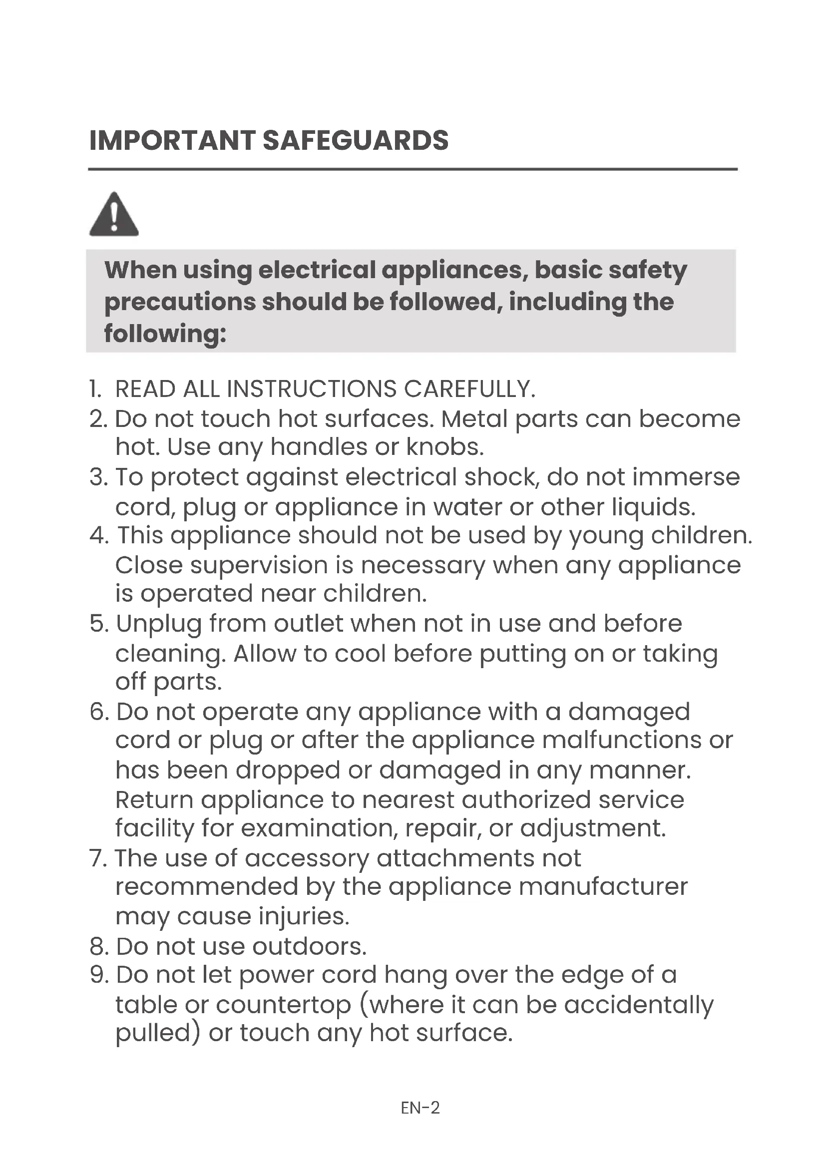table or countertop (where it can be accidentally pulled) or touch any hot surface. IMPORTANT SAFEGUARDS When using electrical appliances, basic safety precautions should be followed, including the following:EN-3