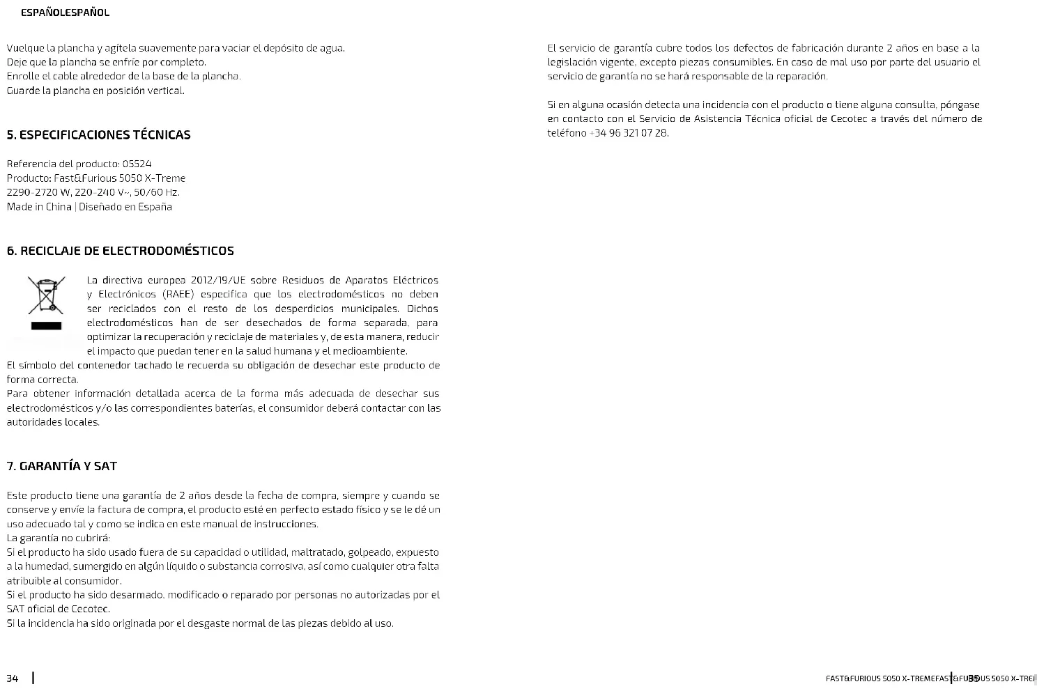 This product is under warranty for 2 years from the date of purchase, as long as the proof of purchase is submitted, the product is in perfect physical condition, and it has been given proper use, as explained in this instruction manual. The warranty will not cover the following situations: The product has been used for purposes other than those intended for it, misused, beaten, exposed to moisture, immersed in liquid or corrosive substances, as well as any other fault attributable to the customer. The product has been disassembled, modified, or repaired by persons, not authorised by the official Technical Support Service of Cecotec. Faults deriving from the normal wear and tear of its parts, due to use. The warranty service covers every manufacturing defects of your appliance for 2 years, based on current legislation, except consumable parts. In the event of misuse, the warranty will not apply. If at any moment you detect any problem with your product or have any doubt, do not hesitate to contact Cecotec Technical Support Service at +34 963 210 728.FAST&FURIOUS 5050 X-TREMEFAST&FURIOUS 5050 X-TREME