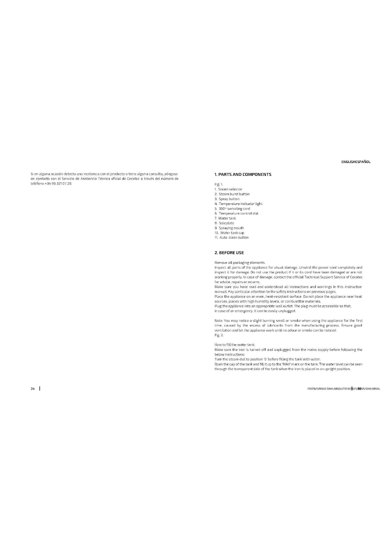 Remove all packaging elements. Inspect all parts of the appliance for visual damage. Unwind the power cord completely and inspect it for damage. Do not use the product if it or its cord have been damaged or are not working properly. In case of damage, contact the official Technical Support Service of Cecotec for advice, repairs or returns. Make sure you have read and understood all instructions and warnings in this instruction manual. Pay particular attention to the safety instructions on previous pages. Place the appliance on an even, heat-resistant surface. Do not place the appliance near heat sources, places with high humidity levels, or combustible materials. Plug the appliance into an appropriate wall outlet. The plug must be accessible so that, in case of an emergency, it can be easily unplugged. Note: You may notice a slight burning smell or smoke when using the appliance for the first time, caused by the excess of lubricants from the manufacturing process. Ensure good ventilation and let the appliance work until no odour or smoke can be noticed. Fig. 2. How to fill the water tank Make sure the iron is turned off and unplugged from the mains supply before following the below instructions: Turn the steam dial to position ‘0’ before filling the tank with water. Open the cap of the tank and fill it up to the ‘MAX’ mark on the tank. The water level can be seen through the transparent side of the tank when the iron is placed in an upright position.FAST&FURIOUS 5040 ABSOLUTEFAST&FURIOUS 5040 ABSOLUTE