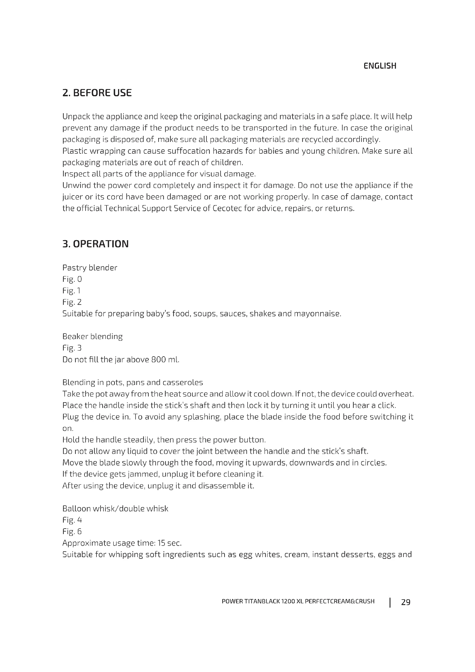 Pastry blender Fig. 0 Fig. 1 Fig. 2 Suitable for preparing baby’s food, soups, sauces, shakes and mayonnaise. Beaker blending Fig. 3 Do not ll the jar above 800 ml. Blending in pots, pans and casseroles Take the pot away from the heat source and allow it cool down. If not, the device could overheat. Place the handle inside the stick’s shaft and then lock it by turning it until you hear a click. Plug the device in. To avoid any splashing, place the blade inside the food before switching it on. Hold the handle steadily, then press the power button. Do not allow any liquid to cover the joint between the handle and the stick’s shaft. Move the blade slowly through the food, moving it upwards, downwards and in circles. If the device gets jammed, unplug it before cleaning it. After using the device, unplug it and disassemble it. Balloon whisk/double whisk Fig. 4 Fig. 6 Approximate usage time: 15 sec. Suitable for whipping soft ingredients such as egg whites, cream, instant desserts, eggs andPOWER TITANBLACK 1200 XL PERFECTCREAM&CRUSH