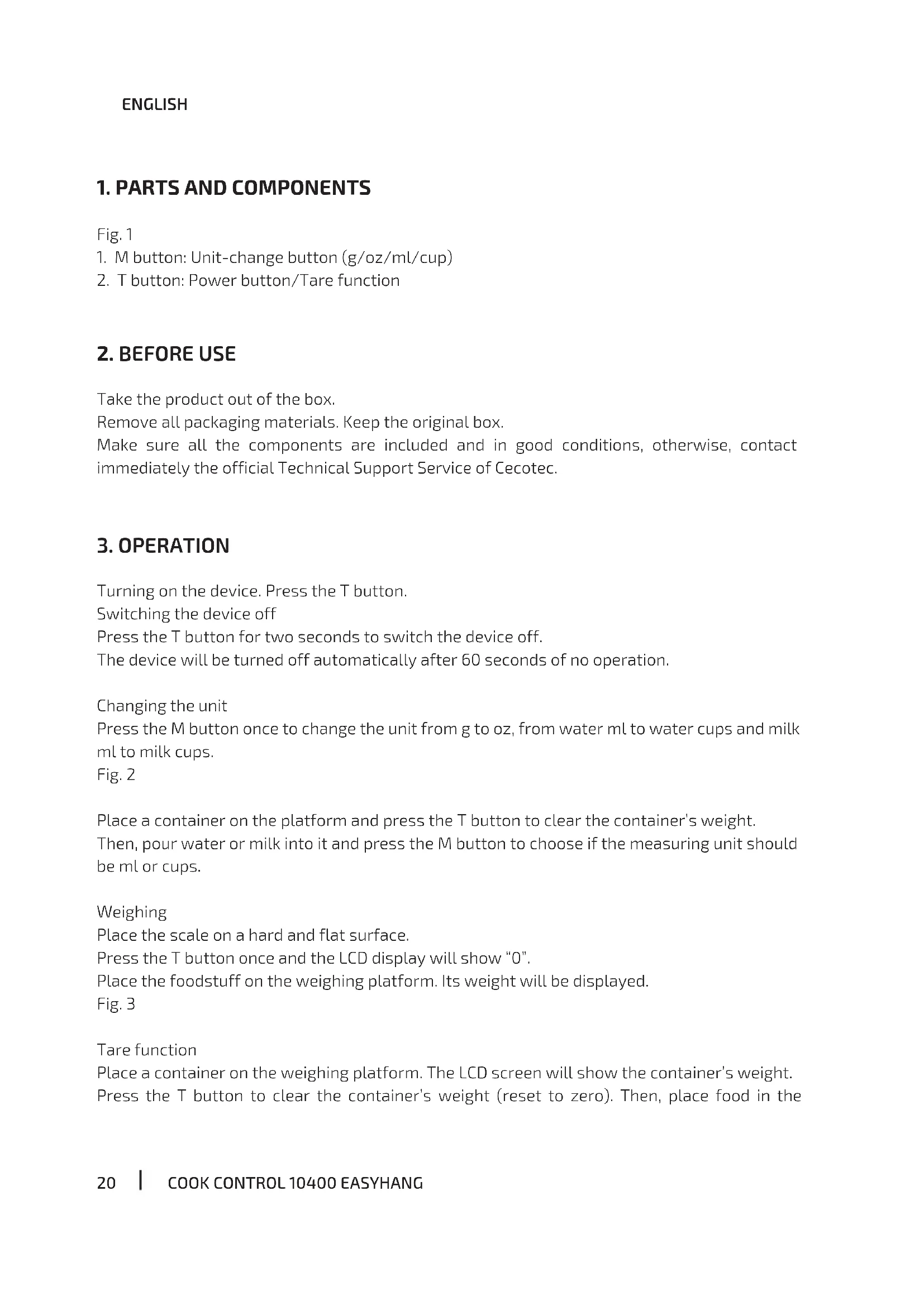 Turning on the device. Press the T button. Switching the device off Press the T button for two seconds to switch the device off. The device will be turned off automatically after 60 seconds of no operation. Changing the unit Press the M button once to change the unit from g to oz, from water ml to water cups and milk ml to milk cups. Fig. 2 Place a container on the platform and press the T button to clear the container’s weight. Then, pour water or milk into it and press the M button to choose if the measuring unit should be ml or cups. Weighing Place the scale on a hard and flat surface. Press the T button once and the LCD display will show “0”. Place the foodstuff on the weighing platform. Its weight will be displayed. Fig. 3 Tare function Place a container on the weighing platform. The LCD screen will show the container’s weight. Press the T button to clear the container’s weight (reset to zero). Then, place food in the 04179_Cook Control 10400 EasyHang_manual_EA_YV_03200917.indd 2004179_Cook Control 10400 EasyHang_manual_EA_YV_03200917.indd 20 17/9/20 13:2717/9/20 13:2721 ENGLISH