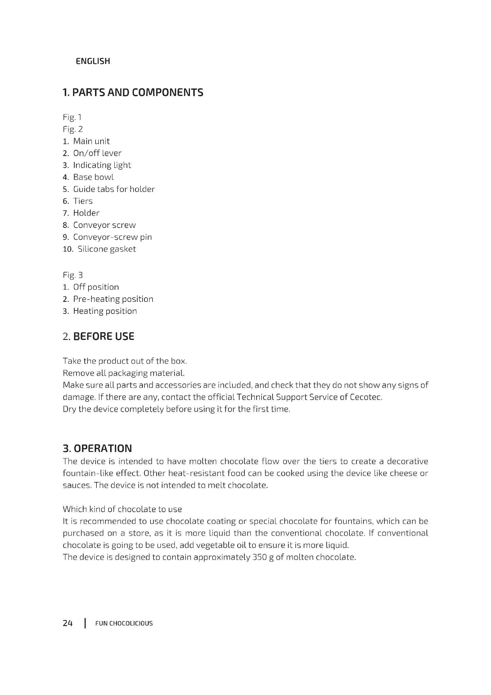 The device is intended to have molten chocolate flow over the tiers to create a decorative fountain-like effect. Other heat-resistant food can be cooked using the device like cheese or sauces. The device is not intended to melt chocolate. Which kind of chocolate to use It is recommended to use chocolate coating or special chocolate for fountains, which can be purchased on a store, as it is more liquid than the conventional chocolate. If conventional chocolate is going to be used, add vegetable oil to ensure it is more liquid. The device is designed to contain approximately 350 g of molten chocolate. 08020_Fun Chocolicious_Manual_YV_01200724.indd 2408020_Fun Chocolicious_Manual_YV_01200724.indd 24 24/7/20 12:5324/7/20 12:53FUN CHOCOLICIOUS