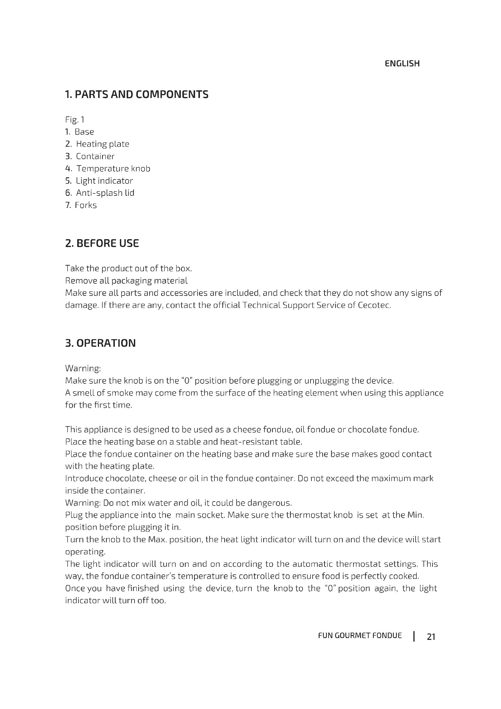 Plug the appliance into the main socket. Make sure the thermostat knob is set at the Min. position before plugging it in. Turn the knob to the Max. position, the heat light indicator will turn on and the device will start operating. The light indicator will turn on and on according to the automatic thermostat settings. This way, the fondue container’s temperature is controlled to ensure food is perfectly cooked. Once you have nished using the device, turn the knob to the “0” position again, the light indicator will turn off too.22 ENGLISH