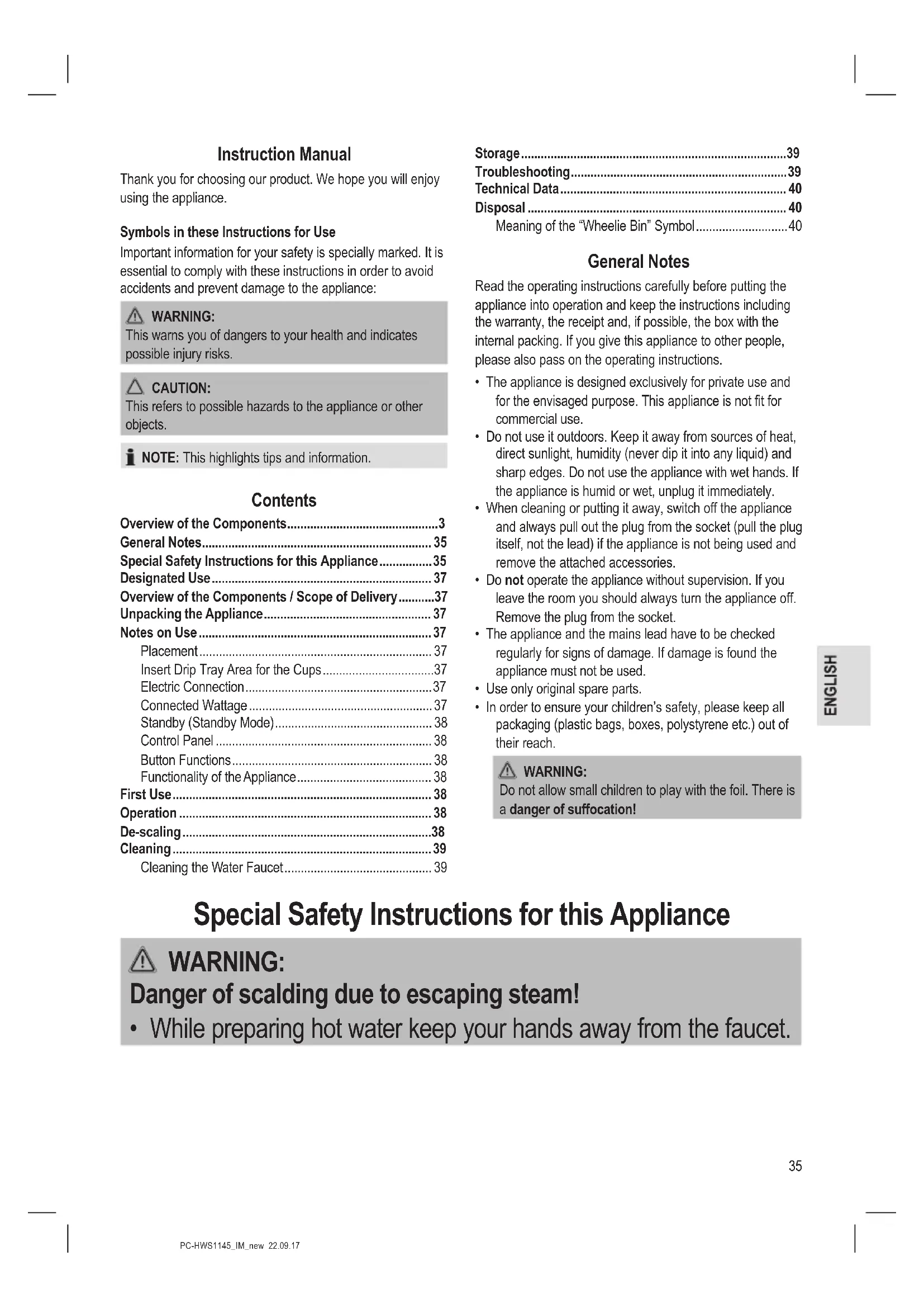 - While preparing hot water keep your hands away from the faucet.36 PC-HWS1145_IM_new 22.09.17