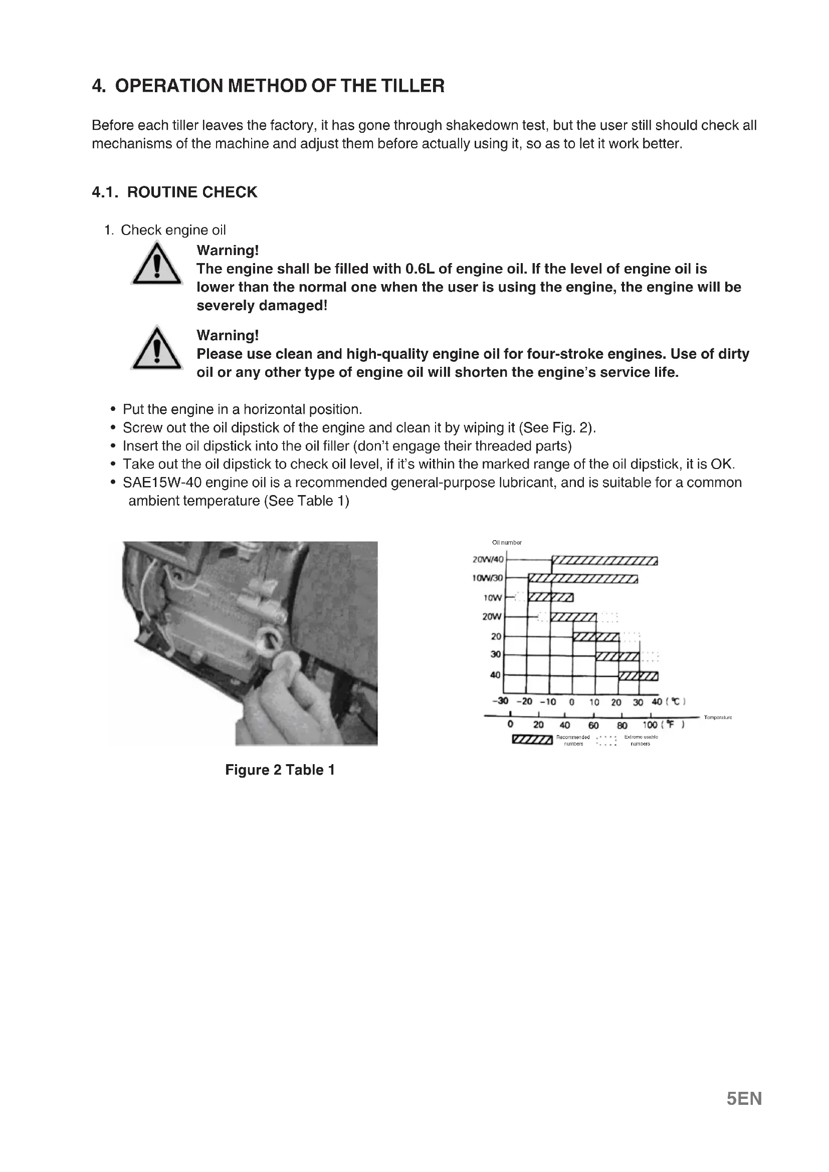 - SAE15W-40 engine oil is a recommended general-purpose lubricant, and is suitable for a common ambient temperature (See Table 1) Oil number Recommended numbers Extreme usable numbers Temperature Figure 2 Table 16 EN