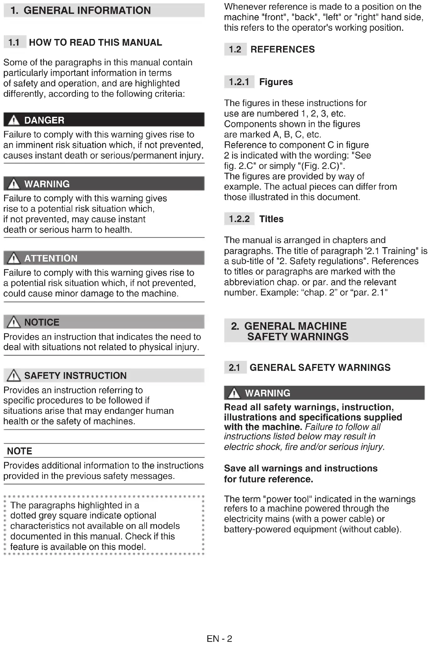 WARNING Read all safety warnings, instruction, illustrations and specications supplied with the machine. Failure to follow all instructions listed below may result in electric shock, re and/or serious injury. Save all warnings and instructions for future reference. The term "power tool" indicated in the warnings refers to a machine powered through the electricity mains (with a power cable) or battery-powered equipment (without cable).EN - 3