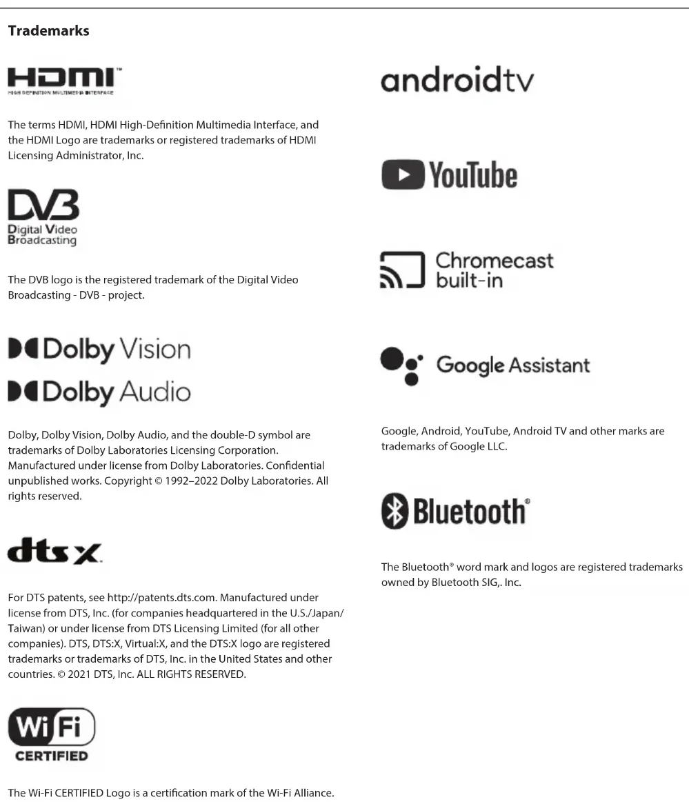 SR ELSL EN NLFRDE IT ES PTTrademarks The terms HDMI, HDMI High-Denition Multimedia Interface, and the HDMI Logo are trademarks or registered trademarks of HDMI Licensing Administrator, Inc. The DVB logo is the registered trademark of the Digital Video Broadcasting - DVB - project. Dolby, Dolby Vision, Dolby Audio, and the double-D symbol are trademarks of Dolby Laboratories Licensing Corporation. Manufactured under license from Dolby Laboratories. Condential unpublished works. Copyright © 1992–2022 Dolby Laboratories. All rights reserved. For DTS patents, see http://patents.dts.com. Manufactured under license from DTS, Inc. (for companies headquartered in the U.S./Japan/ Taiwan) or under license from DTS Licensing Limited (for all other companies). DTS, DTS:X, Virtual:X, and the DTS:X logo are registered trademarks or trademarks of DTS, Inc. in the United States and other countries. © 2021 DTS, Inc. ALL RIGHTS RESERVED. The Wi-Fi CERTIFIED Logo is a certication mark of the Wi-Fi Alliance. Google, Android, YouTube, Android TV and other marks are trademarks of Google LLC. The Bluetooth® word mark and logos are registered trademarks owned by Bluetooth SIG,. Inc.1