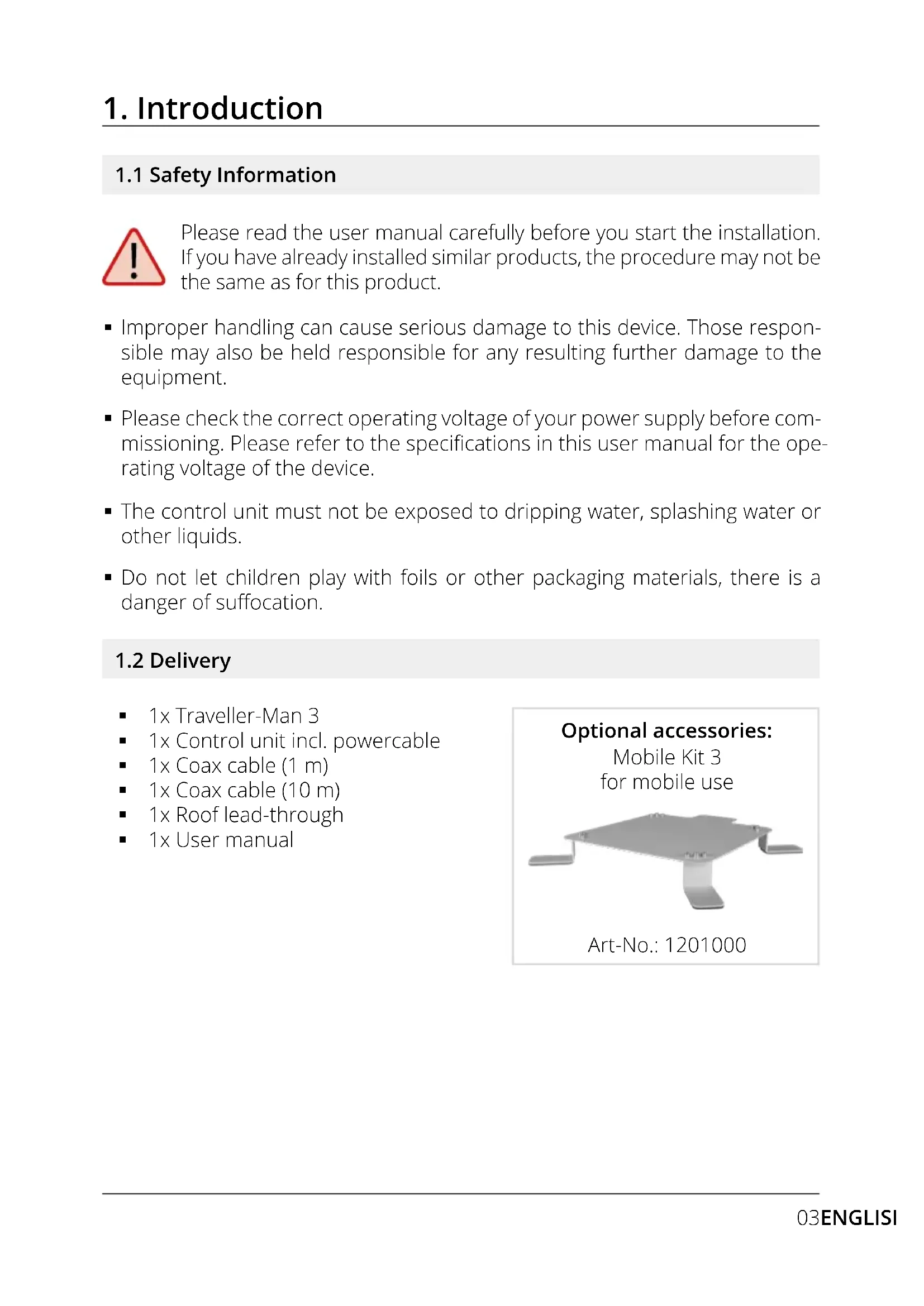 Improper handling can cause serious damage to this device. Those respon- sible may also be held responsible for any resulting further damage to the equipment. Please check the correct operating voltage of your power supply before com- missioning. Please refer to the specications in this user manual for the ope- rating voltage of the device. The control unit must not be exposed to dripping water, splashing water or other liquids. Do not let children play with foils or other packaging materials, there is a danger of suocation. 1x Traveller-Man 3 1x Control unit incl. powercable 1x Coax cable (1 m) 1x Coax cable (10 m) 1x Roof lead-through 1x User manual Optional accessories: Mobile Kit 3 for mobile use Art-No.: 12010001. Introduction Antenna unit The high-performance antenna, the elevation angle of 0-90° and the auto-skew function enable the best possible reception in the most important holiday destinations in Europe. WARNING! Never touch the antenna direc- tly to the dish when lifting it out of the box. Lift the antenna by the base plate. Control unit The control unit is used for satellite selection and control. It is connected between antenna and TV (receiver) and supplies the antenna with power. After successful alignment the device can be switched o. Open the carton and remove the control unit, connection cables and packing material. Lift the antenna straight up out of the box. Never turn the system upside down!