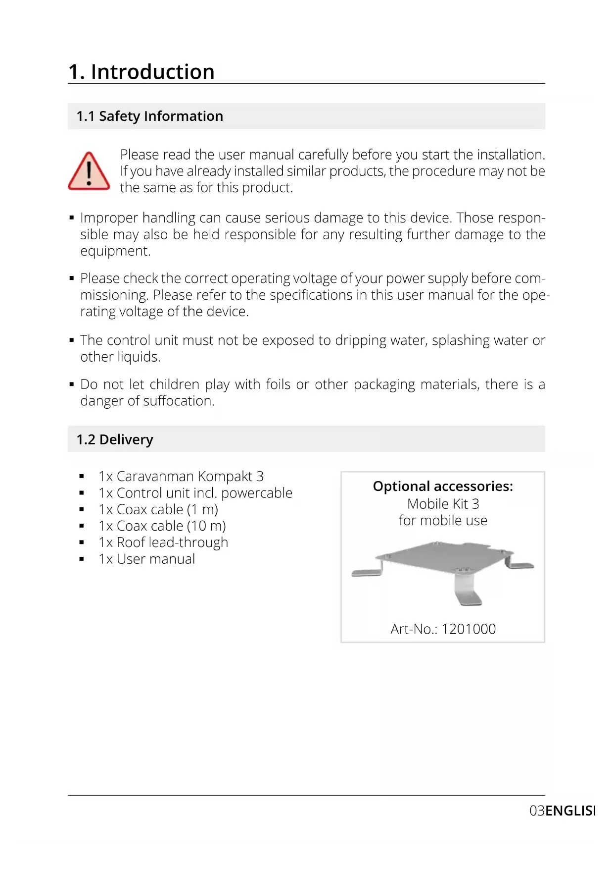 Improper handling can cause serious damage to this device. Those respon- sible may also be held responsible for any resulting further damage to the equipment. Please check the correct operating voltage of your power supply before com- missioning. Please refer to the specications in this user manual for the ope- rating voltage of the device. The control unit must not be exposed to dripping water, splashing water or other liquids. Do not let children play with foils or other packaging materials, there is a danger of suocation. 1x Caravanman Kompakt 3 1x Control unit incl. powercable 1x Coax cable (1 m) 1x Coax cable (10 m) 1x Roof lead-through 1x User manual Optional accessories: Mobile Kit 3 for mobile use Art-No.: 12010001. Introduction Antenna unit The high performance antenna and the elevation angle of 15- 62° allows the best possible reception in the most important holiday destinations in Europe. WARNING! Never touch the antenna direc- tly to the mirror when lifting it out of the box. Lift the antenna by the base plate. Control unit The control unit is used for satellite selection and control. It is connected between antenna and TV (receiver) and supplies the antenna with power. After successful alignment the device can be switched o. Open the carton and remove the control unit, connection cables and packing material. Lift the antenna straight up out of the box. Never turn the system upside down!