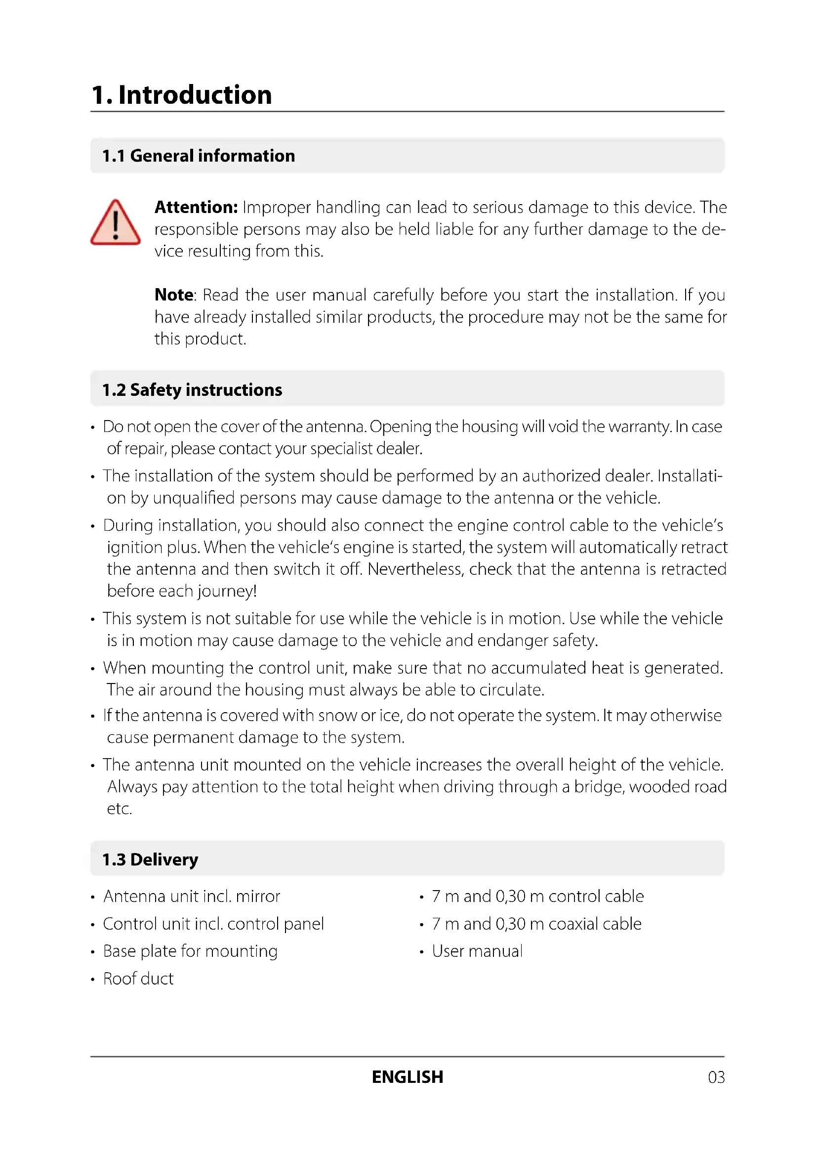 - Do not open the cover of the antenna. Opening the housing will void the warranty. In case of repair, please contact your specialist dealer.