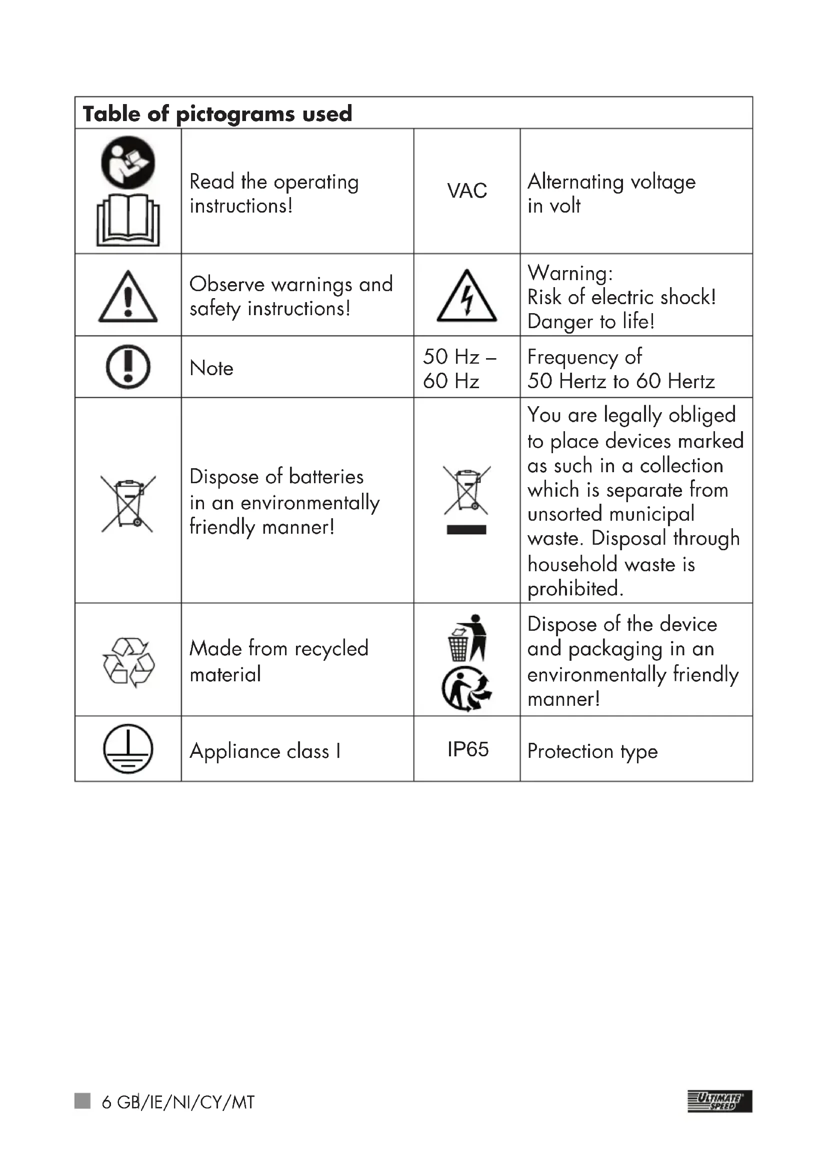 Risk of electric shock! Danger to life! Note 50 Hz – 60 Hz Frequency of 50 Hertz to 60 Hertz Dispose of batteries in an environmentally friendly manner! You are legally obliged to place devices marked as such in a collection which is separate from unsorted municipal waste. Disposal through household waste is prohibited. Made from recycled material Dispose of the device and packaging in an environmentally friendly manner! Appliance class I IP65 Protection type7GB/IE/NI/CY/MT CHARGING CABLE