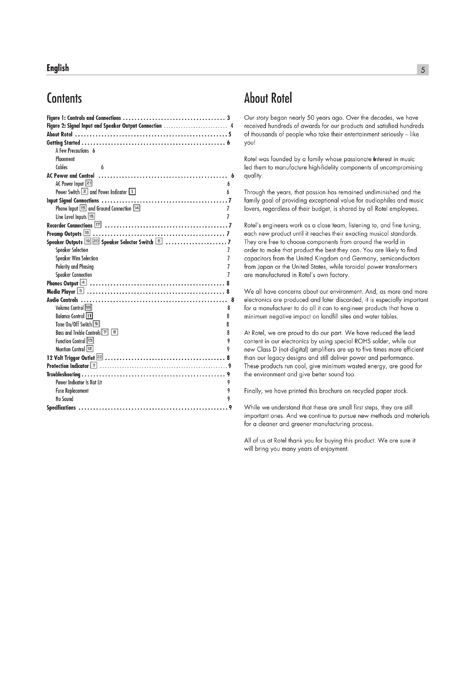 - TO REDUCE THE RISK OF THE FIRE OR ELECTRICAL SHOCK, DO NOT EXPOSE THIS EQUIPMENT TO RAIN OR MOISTURE. DOUBLE INSULATION When servicing use only identical replacement parts. ROTEL5 English About Rotel Our story began nearly 50 years ago. Over the decades, we have received hundreds of awards for our products and satisfied hundreds of thousands of people who take their entertainment seriously – like you! Rotel was founded by a family whose passionate interest in music led them to manufacture high-fidelity components of uncompromising quality. Through the years, that passion has remained undiminished and the family goal of providing exceptional value for audiophiles and music lovers, regardless of their budget, is shared by all Rotel employees. Rotel’s engineers work as a close team, listening to, and fine tuning, each new product until it reaches their exacting musical standards. They are free to choose components from around the world in order to make that product the best they can. You are likely to find capacitors from the United Kingdom and Germany, semiconductors from Japan or the United States, while toroidal power transformers are manufactured in Rotel’s own factory. We all have concerns about our environment. And, as more and more electronics are produced and later discarded, it is especially important for a manufacturer to do all it can to engineer products that have a minimum negative impact on landfill sites and water tables. At Rotel, we are proud to do our part. We have reduced the lead content in our electronics by using special ROHS solder, while our new Class D (not digital) amplifiers are up to five times more efficient than our legacy designs and still deliver power and performance. These products run cool, give minimum wasted energy, are good for the environment and give better sound too. Finally, we have printed this brochure on recycled paper stock. While we understand that these are small first steps, they are still important ones. And we continue to pursue new methods and materials for a cleaner and greener manufacturing process. All of us at Rotel thank you for buying this product. We are sure it will bring you many years of enjoyment. Contents Figure 1: Controls and Connections p. 3