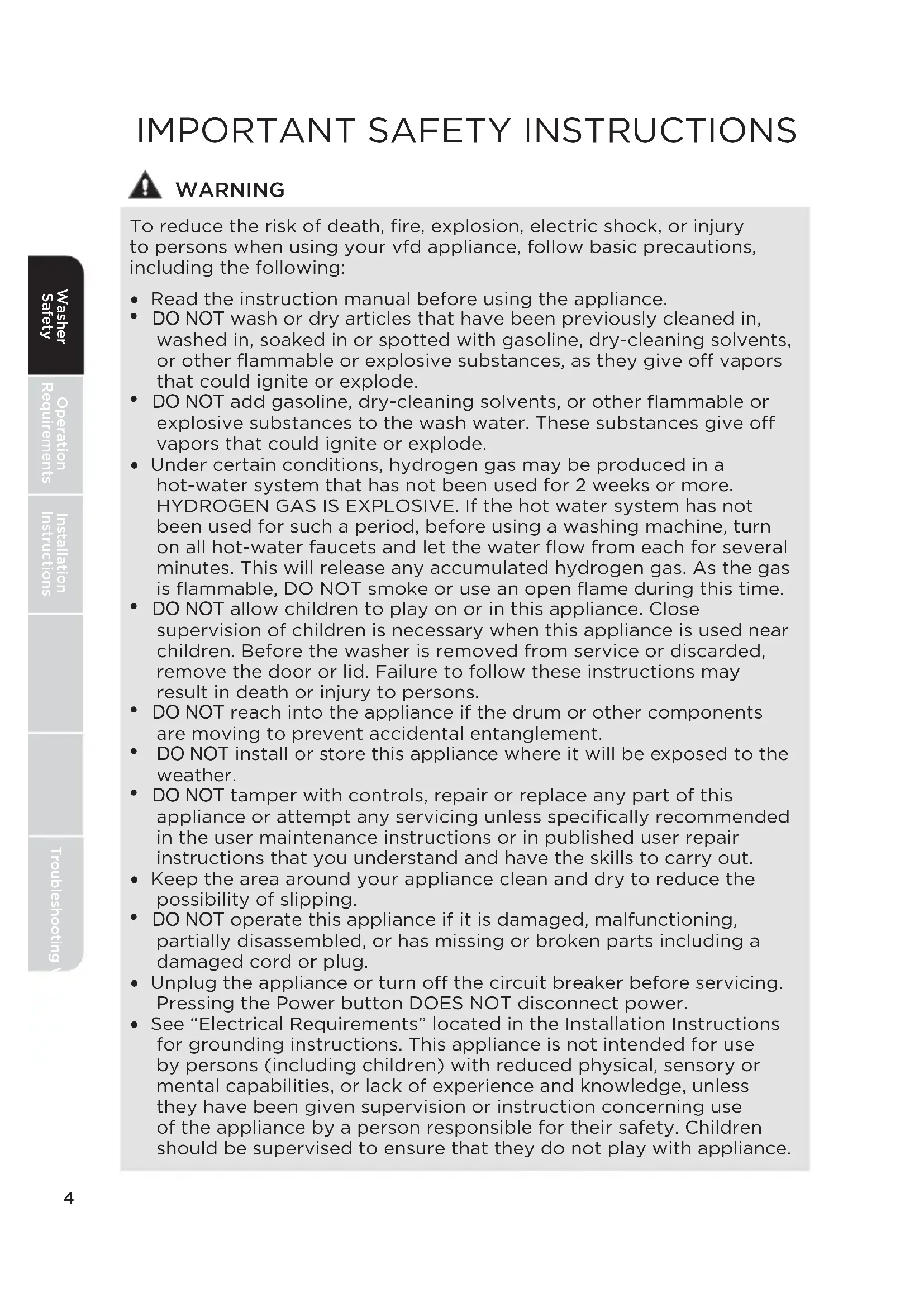 - DO NOT allow children to play on or in this appliance. Close supervision of children is necessary when this appliance is used near children. Before the washer is removed from service or discarded, remove the door or lid. Failure to follow these instructions may result in death or injury to persons.