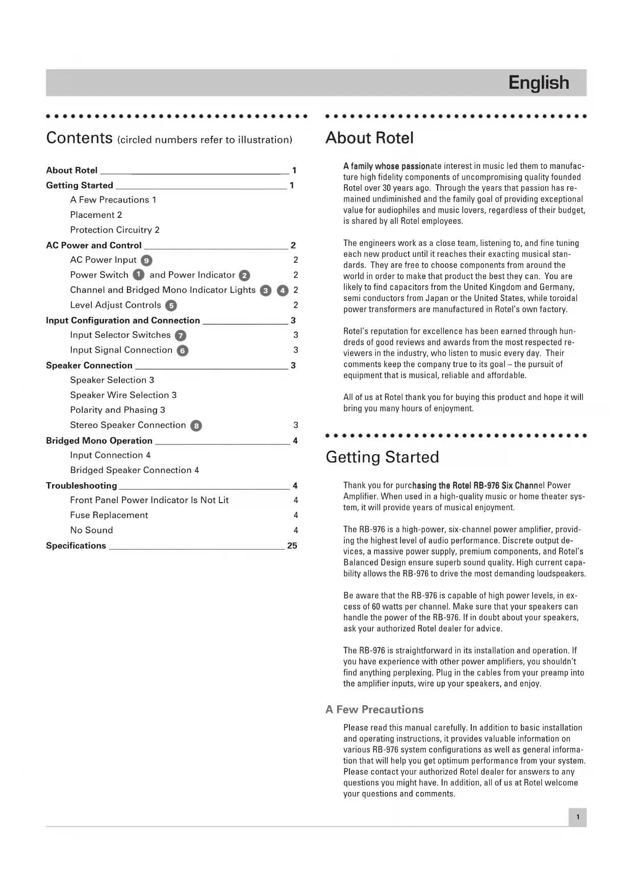 CENTER CHANNEL○○○○○○○○○○○○○○○○○○○○○○○○○○○○○○○○○ About Rotel A family whose passionate interest in music led them to manufac- ture high fidelity components of uncompromising quality founded Rotel over 30 years ago. Through the years that passion has re- mained undiminished and the family goal of providing exceptional value for audiophiles and music lovers, regardless of their budget, is shared by all Rotel employees. The engineers work as a close team, listening to, and fine tuning each new product until it reaches their exacting musical stan- dards. They are free to choose components from around the world in order to make that product the best they can. You are likely to find capacitors from the United Kingdom and Germany, semi conductors from Japan or the United States, while toroidal power transformers are manufactured in Rotel’s own factory. Rotel’s reputation for excellence has been earned through hun- dreds of good reviews and awards from the most respected re- viewers in the industry, who listen to music every day. Their comments keep the company true to its goal – the pursuit of equipment that is musical, reliable and affordable. All of us at Rotel thank you for buying this product and hope it will bring you many hours of enjoyment. ○○○○○○○○○○○○○○○○○○○○○○○○○○○○○○○○○ Getting Started Thank you for purchasing the Rotel RB-976 Six Channel Power Amplifier. When used in a high-quality music or home theater sys- tem, it will provide years of musical enjoyment. The RB-976 is a high-power, six-channel power amplifier, provid- ing the highest level of audio performance. Discrete output de- vices, a massive power supply, premium components, and Rotel’s Balanced Design ensure superb sound quality. High current capa- bility allows the RB-976 to drive the most demanding loudspeakers. Be aware that the RB-976 is capable of high power levels, in ex- cess of 60 watts per channel. Make sure that your speakers can handle the power of the RB-976. If in doubt about your speakers, ask your authorized Rotel dealer for advice. The RB-976 is straightforward in its installation and operation. If you have experience with other power amplifiers, you shouldn’t find anything perplexing. Plug in the cables from your preamp into the amplifier inputs, wire up your speakers, and enjoy. A Few Precautions Please read this manual carefully. In addition to basic installation and operating instructions, it provides valuable information on various RB-976 system configurations as well as general informa- tion that will help you get optimum performance from your system. Please contact your authorized Rotel dealer for answers to any questions you might have. In addition, all of us at Rotel welcome your questions and comments. ○○○○○○○○○○○○○○○○○○○○○○○○○○○○○○○○○ Contents (circled numbers refer to illustration) About Rotel __________________________________________ 1 Getting Started ______________________________________ 1 A Few Precautions 1 Placement 2 Protection Circuitry 2 AC Power and Control ________________________________ 2 AC Power Input