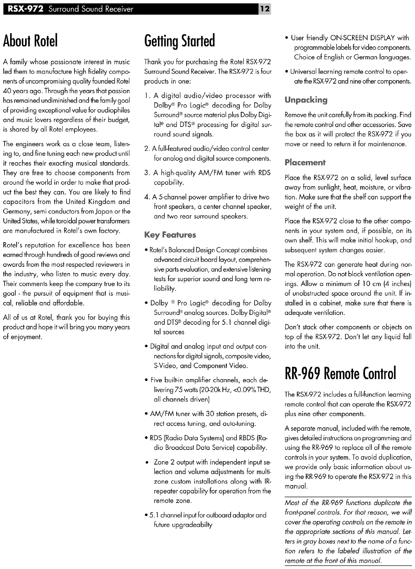 - Rotel’s Balanced Design Concept combinesadvanced circuit board layout, comprehen-sive parts evaluation, and extensive listeningtests for superior sound and long term re-liability.• Dolby Pro Logic decoding for DolbySurround analog sources. Dolby Digital and DTS decoding for 5.1 channel digi-tal sources• Digital and analog input and output con-nections for digital signals, composite video,S-Video, and Component Video.• Five built-in amplifier channels, each de-livering 75 watts (20-20k Hz, <0.09% THD,all channels driven)• AM/FM tuner with 30 station presets, di-rect access tuning, and auto-tuning.• RDS (Radio Data Systems) and RBDS (Ra-dio Broadcast Data Service) capability. Zone 2 output with independent input se-lection and volume adjustments for multi-zone custom installations along with IR-repeater capability for operation from theremote zone.• 5.1 channel input for outboard adaptor andfuture upgradeabilty13 Using the RR-969 To operate the RSX-972 with the remote, makesure that the AUDIO mode is active by press-ing the AUD button on the remote beforeyou start. The AUDIO mode will stay activeuntil another DEVICE button is pressed. Programming the RR-969 The RR-969 is preprogrammed to operate theRSX-972. Should the AUDIO command set onyour RR-969 not operate the RSX-972, theprogramming may have been changed. To re-store the RSX-972 programming, press the re-cessed PRELOAD button on the remote withthe tip of a ballpoint pen. NOTE : Pushing the PRELOAD button will erase all custom programming and learned com- mands, restoring the RR-969 to its factory condition. Basic Controls We suggest you look over the RSX-972’s frontand rear panels before you start connectingother components. The following explanationswill help you get familiar with the unit’s con-nections, features, and controls.Most functions are duplicated on the front-paneland on the remote. A few are found only onone or the other. Throughout this manual, num-bers in gray boxes refer to the RSX-972 illus-tration at the front of this manual. Letters referto the RR-969 remote illustration. When bothappear, the function is found on both theRSX-972 and the remote. When only one ap-pears, that function is found only on the RSX-972or the remote. POWER Switch The front-panel POWER switch on the RSX-972is a master power control. It must be pressedIN for the unit to operate. When it is in theOUT position, the unit is fully off and cannotbe activated from the remote control. ThePOWER switch on the remote functions as astandby switch, activating or deactivating theunit. In standby mode, minimal power is stillsupplied to memory circuits to preserve set-tings. When the unit has AC power appliedand the front-panel POWER button is pressedIN, the front-panel POWER LED lights, regard-less of whether the unit in standby mode orfully-activated in the main roomThere are three available power mode optionsfor the RSX-972, selected during set-up froman ON-SCREEN DISPLAY menu. The defaultDIRECT mode fully activates the unit wheneverAC power is supplied and the front-panelPOWER button is pressed IN; however, theremote POWER switch can still be used toactivate or deactivate the unit. With theSTANDBY power option, the unit powers upin standby mode when AC is first applied andthe front-panel POWER button is pressed IN.The unit must be manually activated with theremote control POWER button. With the AL-WAYS-ON power option, the unit is fully op-erational whenever AC is applied and the front-panel POWER button is pressed IN. The re-mote POWER button is disabled. When using Zone 2, the standby operation is completely independent for the main room and Zone 2. The remote control POWER but- ton will not affect Zone 2. Pressing the POWER button on a remote located in Zone 2 will only affect that zone and not the main room. When the unit is in standby mode in the main room and activated in ZONE 2, the front-panel POWER LED flashes. Remote Sensor This sensor receives IR signals from the remotecontrol. Do not block this sensor. Front-panel Display The fluorescent (FL) display in the upper por-tion of the RSX-972 provides status informa-tion. An alphanumeric display shows the nameof the source selected for listening on the leftand the source selected for recording on theright. At the bottom of the display are statusindicators for surround modes and other set-tings. At the right side of the display are indi-cators including input source connections.The FL display can be turned off by pressingand holding the MENU button on the re-mote for three seconds. The display can beturned back on by briefly pressing the MENUbutton again or by pressing the POWER but-tons on the remote or on the front-panel. Volume Control The VOLUME control adjusts the level of alloutput channels. Rotate the front-panel controlclockwise to increase the volume, counterclock-wise to decrease. The RR-969 remote has VOL-UME UP and DOWN buttons.When you adjust the volume, a digital read-out appears in the front-panel display and thenew setting appears on your TV monitor. NOTE : The VOLUME control can be used to change the volume in Zone 2. Press the front- panel ZONE button and adjust the volume. After 10 seconds, the VOLUME control re- verts to normal operation. MUTE Button Push the MUTE button once to turn the soundoff. An indication appears in the front-paneland on-screen displays. Press the button againto restore previous volume levels. Tone Controls BASS and TREBLE controls increase or decreasethe audio signal’s low and high frequencycontent respectively. Rotate clockwise to in-crease output and counterclockwise to reduce.The front-panel display and ON-SCREEN DIS-PLAY show tone control settings as you adjustthem. MENU Button Push this button on the remote to turn on theON-SCREEN DISPLAY menu system. If the menusystem is already visible, push this button tocancel the display.The MENU button can also be used to turnon and off the front-panel FL display. Press andhold the MENU but