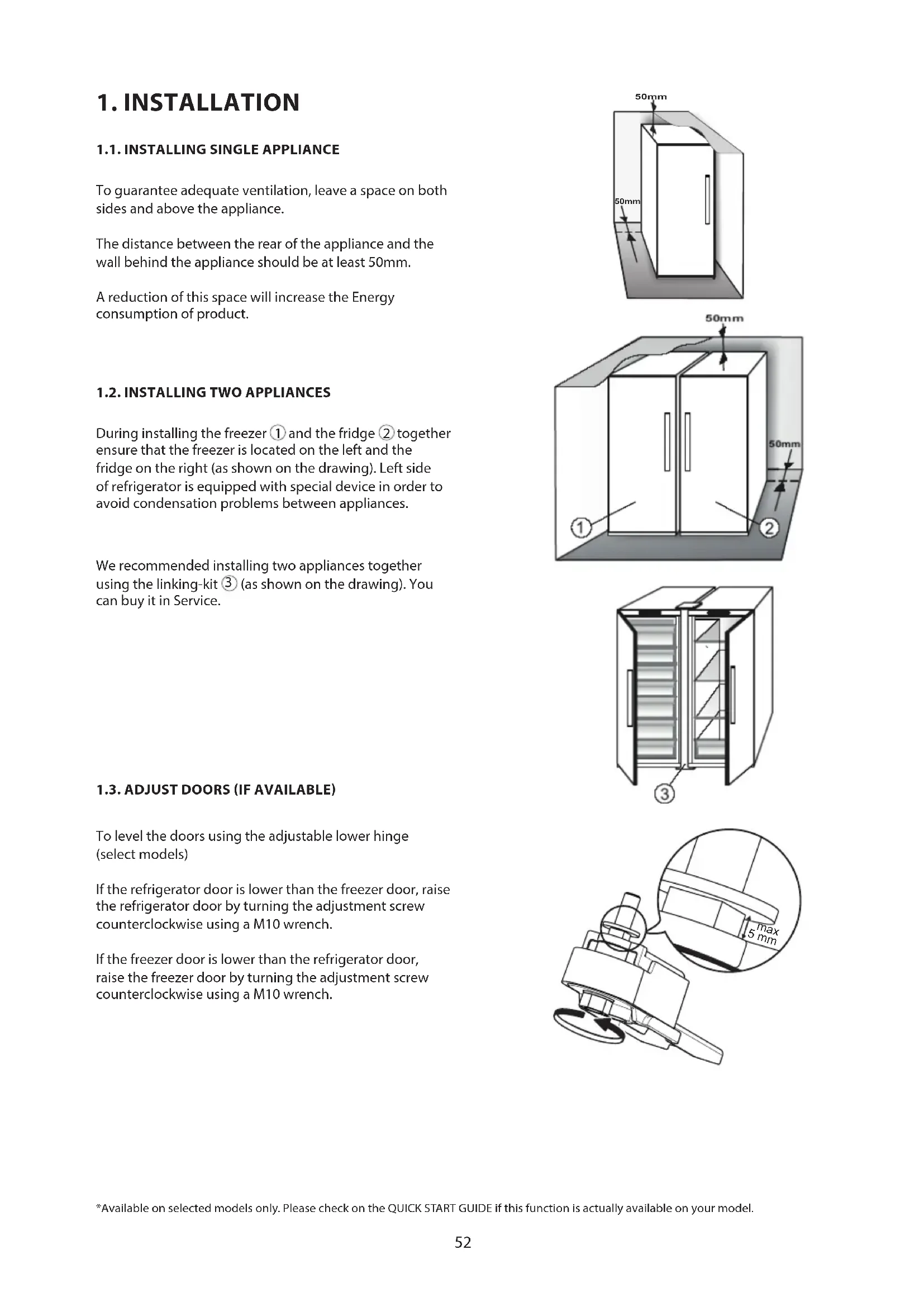(as shown on the drawing). You can buy it in Service. 1.3. ADJUST DOORS (IF AVAILABLE) To level the doors using the adjustable lower hinge (select models) If the refrigerator door is lower than the freezer door, raise the refrigerator door by turning the adjustment screw counterclockwise using a M10 wrench. If the freezer door is lower than the refrigerator door, raise the freezer door by turning the adjustment screw counterclockwise using a M10 wrench. *Available on selected models only. Please check on the QUICK START GUIDE if this function is actually available on your model. 50mm 50mm 5 mm max53