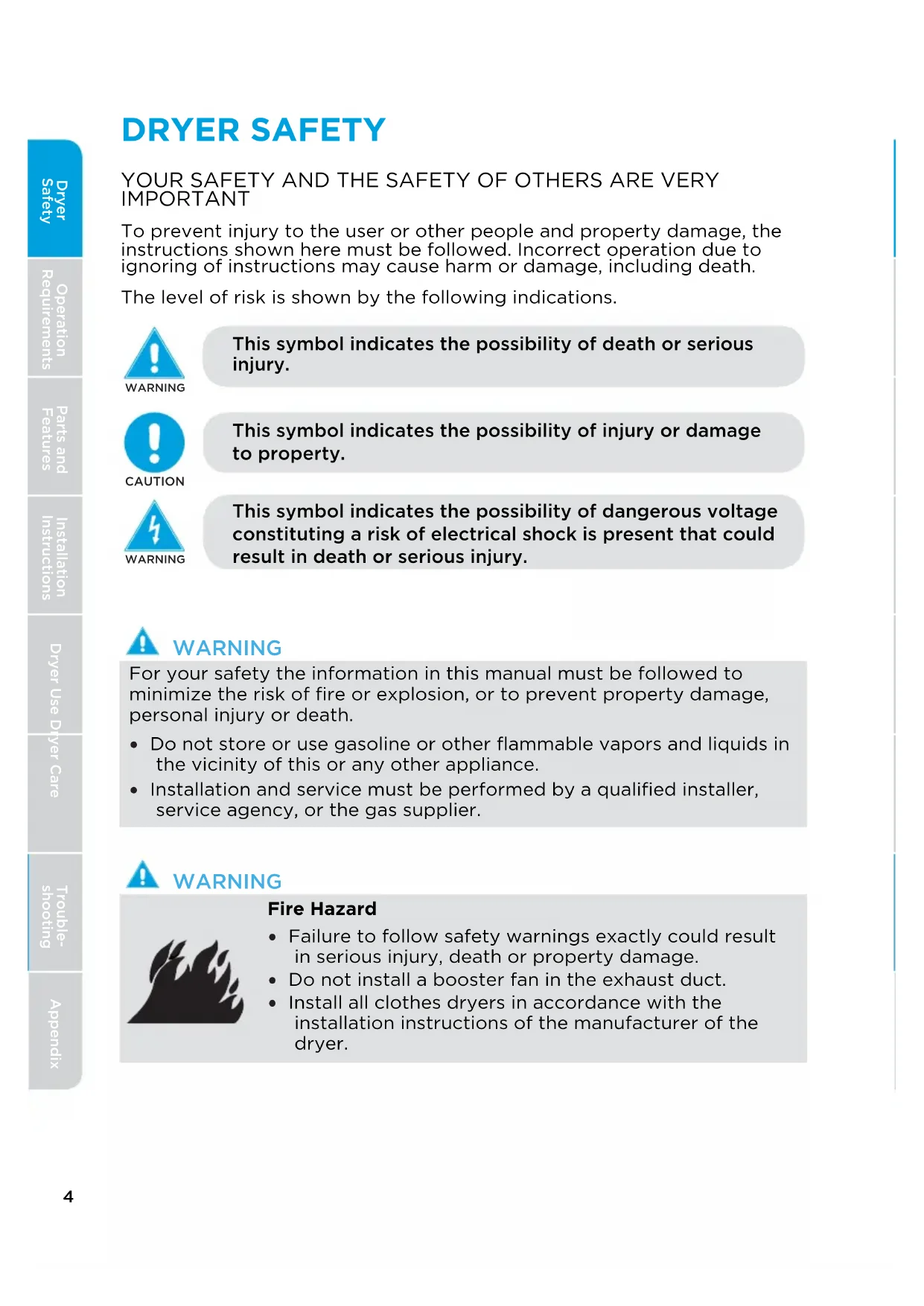This symbol indicates the possibility of dangerous voltage constituting a risk of electrical shock is present that could result in death or serious injury. This symbol indicates the possibility of death or serious injury. This symbol indicates the possibility of injury or damage to property. Appendix5 Dryer Safety Operation Requirements Parts and Features Installation Instructions Dryer Use Dryer Care Trouble- shooting Appendix To reduce the risk of fire, electric shock, or injury to persons when using your appliance, follow basic precautions ,including the following: