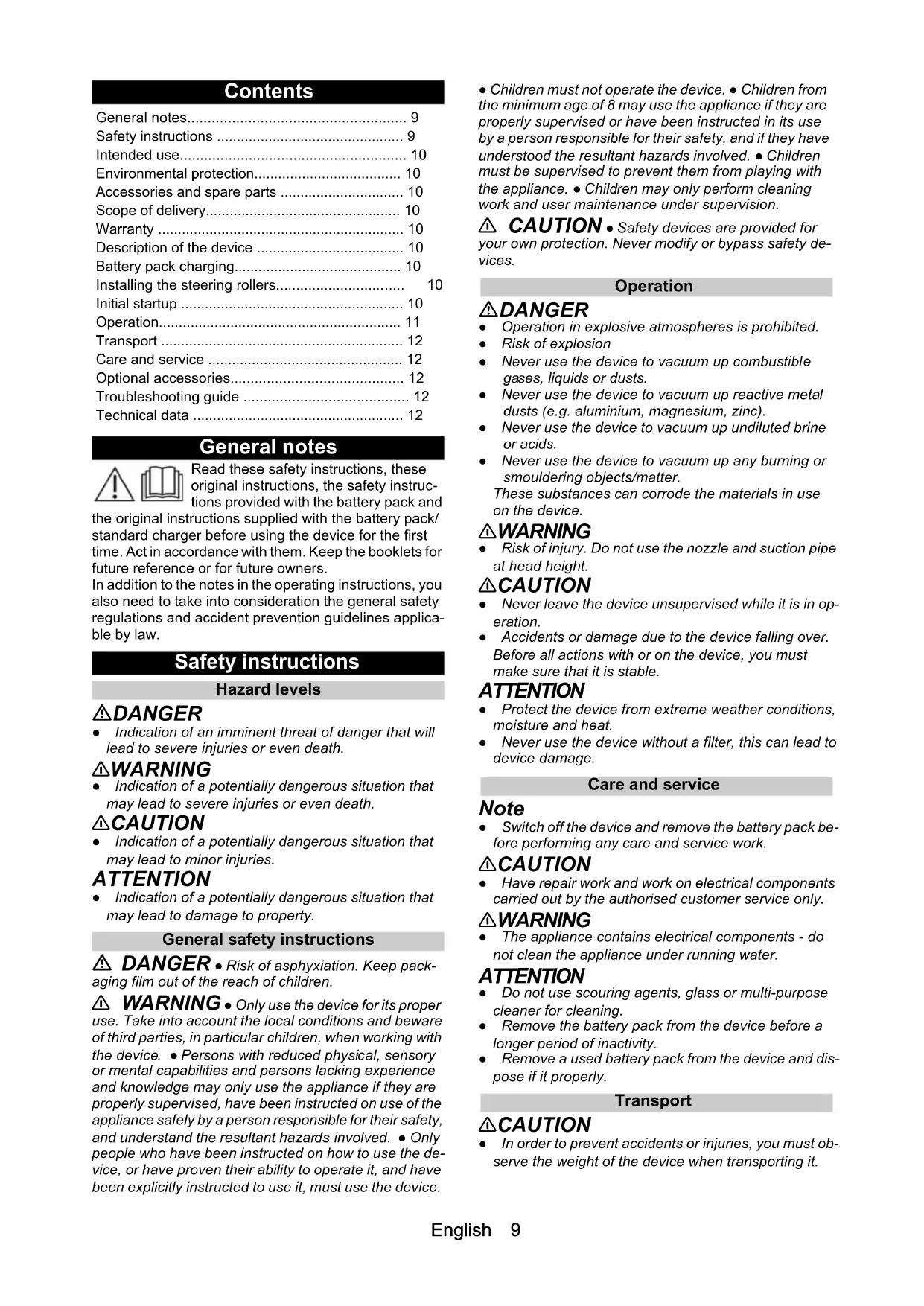 - dusts (e.g. aluminium, magnesium, zinc). ● Never use the device to vacuum up undiluted brine or acids. ● Never use the device to vacuum up any burning or smouldering objects/matter. These substances can corrode the materials in use on the device. 몇 WARNING ● Risk of injury. Do not use the nozzle and suction pipe at head height. 몇 CAUTION ● Never leave the device unsupervised while it is in op- eration. ● Accidents or damage due to the device falling over. Before all actions with or on the device, you must make sure that it is stable. ATTENTION ● Protect the device from extreme weather conditions, moisture and heat. ● Never use the device without a filter, this can lead to device damage. Care and service Note ● Switch off the device and remove the battery pack be- fore performing any care and service work. 몇 CAUTION ● Have repair work and work on electrical components carried out by the authorised customer service only. 몇 WARNING ● The appliance contains electrical components - do not clean the appliance under running water. ATTENTION ● Do not use scouring agents, glass or multi-purpose cleaner for cleaning. ● Remove the battery pack from the device before a longer period of inactivity. ● Remove a used battery pack from the device and dis- pose if it properly. Transport 몇 CAUTION ● In order to prevent accidents or injuries, you must ob- serve the weight of the device when transporting it. General notes p. 9