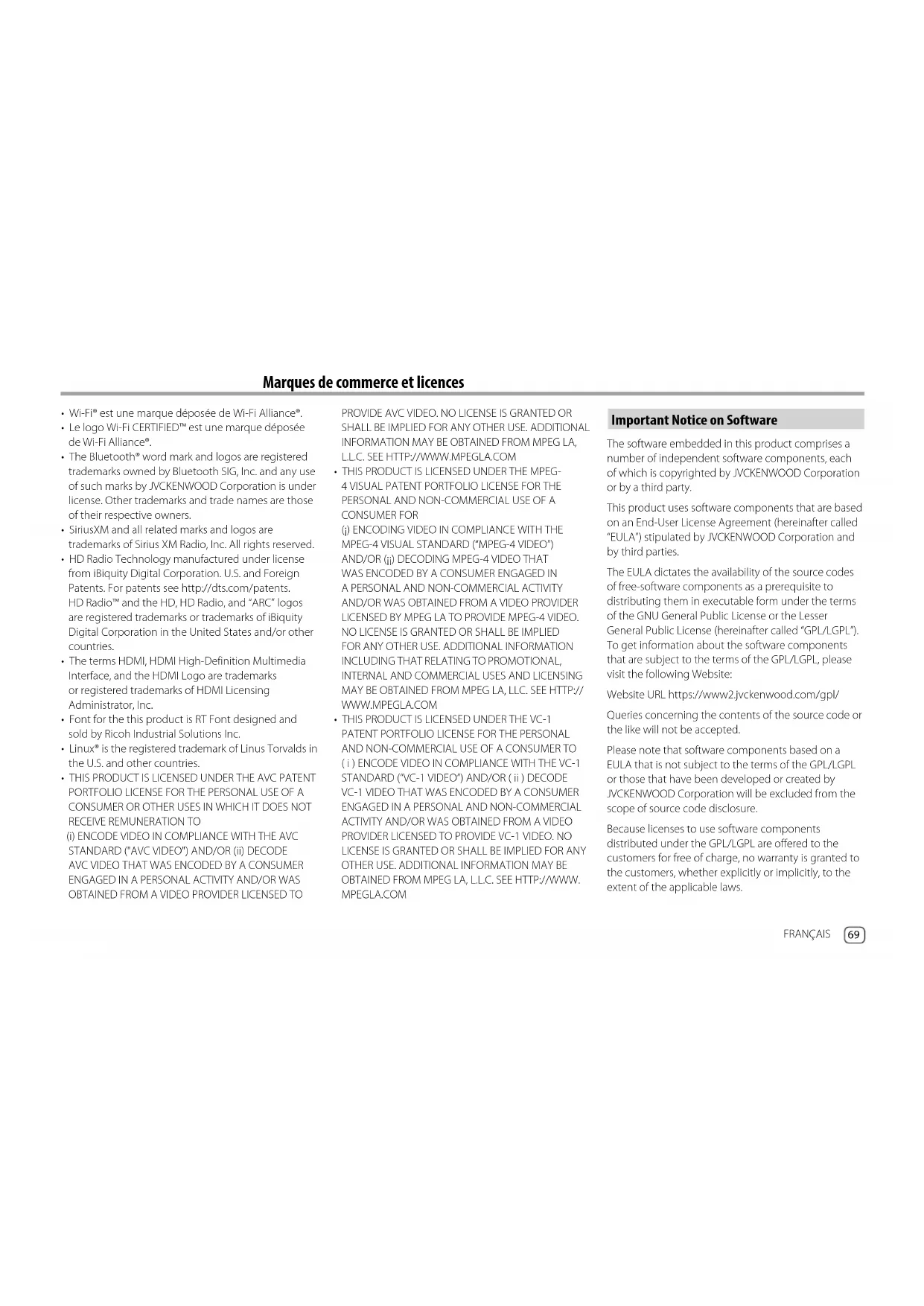 FRANÇAIS 01_DMX_809S_KN_FR.indb 6801_DMX_809S_KN_FR.indb 68 10/7/2022 6:56:06 PM10/7/2022 6:56:06 PMMarques de commerce et licencesMarques de commerce et licences Important Notice on Software The software embedded in this product comprises a number of independent software components, each of which is copyrighted by JVCKENWOOD Corporation or by a third party. This product uses software components that are based on an End-User License Agreement (hereinafter called “EULA”) stipulated by JVCKENWOOD Corporation and by third parties. The EULA dictates the availability of the source codes of free-software components as a prerequisite to distributing them in executable form under the terms of the GNU General Public License or the Lesser General Public License (hereinafter called “GPL/LGPL”). To get information about the software components that are subject to the terms of the GPL/LGPL, please visit the following Website: Website URL https://www2.jvckenwood.com/gpl/ Queries concerning the contents of the source code or the like will not be accepted. Please note that software components based on a EULA that is not subject to the terms of the GPL/LGPL or those that have been developed or created by JVCKENWOOD Corporation will be excluded from the scope of source code disclosure. Because licenses to use software components distributed under the GPL/LGPL are offered to the customers for free of charge, no warranty is granted to the customers, whether explicitly or implicitly, to the extent of the applicable laws.