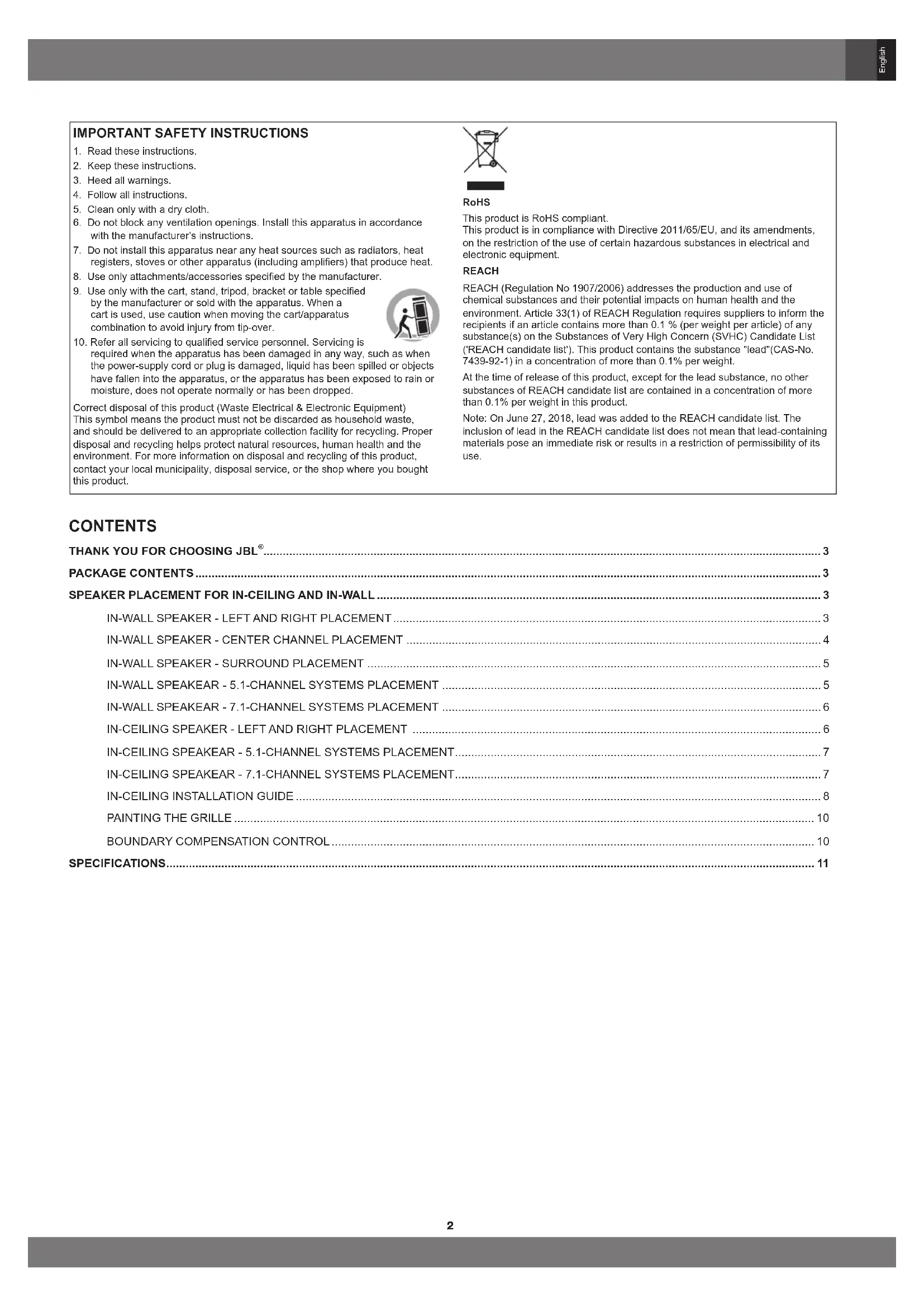 For more than 70 years, JBL engineers have been providing audio equipment for homes, concert halls, recording studios and movie theaters around the world, and JBL products have become the hands-down choice of leading recording artists and sound engineers. The SCL-5, SCL-6, SCL-7, and SCL-8 are the latest members of the JBL Synthesis Home Theater line. To get the best performance from your new loudspeakers, please read these instructions thoroughly. PACKAGE CONTENTS EACH JBL SCL-5 / SCL-6 / SCL-7 / SCL-8 PACKAGE CONTAINS: 1x SCL-6 or 1x SCL-7 1x Quick Start Guide1x Square Grille 1x Template 1x Scrim Cloth Quick Start Guide Grille Template 1x SCL-5 or 1x SCL-8 1x Round and 1x Square Grilles 1x Template 1x Quick Start Guide Grille Template Grille Quick Start Guide 2x Scrim Cloths If you suspect that there has been shipping damage, report it immediately to your dealer. We recommend that you keep the box and packing materials for future use.