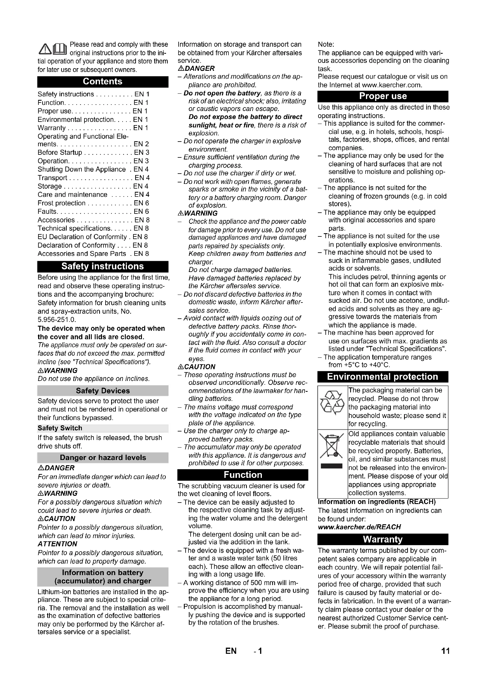 Chairman of the Board of Management Director Regulatory Affairs & Certification Zubehör und Ersatzteile 10 DE- 1 Please read and comply with these original instructions prior to the ini- tial operation of your appliance and store them for later use or subsequent owners. Before using the appliance for the first time, read and observe these operating instruc- tions and the accompanying brochure: Safety information for brush cleaning units and spray-extraction units, No. 5.956-251.0. The device may only be operated when the cover and all lids are closed. The appliance must only be operated on sur- faces that do not exceed the max. permitted incline (see "Technical Specifications"). 몇 WARNING Do not use the appliance on inclines. Safety devices serve to protect the user and must not be rendered in operational or their functions bypassed. If the safety switch is released, the brush drive shuts off. DANGER For an immediate danger which can lead to severe injuries or death. 몇 WARNING For a possibly dangerous situation which could lead to severe injuries or death. 몇 CAUTION Pointer to a possibly dangerous situation, which can lead to minor injuries. ATTENTION Pointer to a possibly dangerous situation, which can lead to property damage. Lithium-ion batteries are installed in the ap- pliance. These are subject to special crite- ria. The removal and the installation as well as the examination of defective batteries may only be performed by the Kärcher af- tersales service or a specialist. Information on storage and transport can be obtained from your Kärcher aftersales service. DANGER – Alterations and modifications on the ap- pliance are prohibited. – Do not open the battery, as there is a risk of an electrical shock; also, irritating or caustic vapors can escape. Do not expose the battery to direct sunlight, heat or fire, there is a risk of explosion. – Do not operate the charger in explosive environment. – Ensure sufficient ventilation during the charging process. – Do not use the charger if dirty or wet. – Do not work with open flames, generate sparks or smoke in the vicinity of a bat- tery or a battery charging room. Danger of explosion. 몇 WARNING