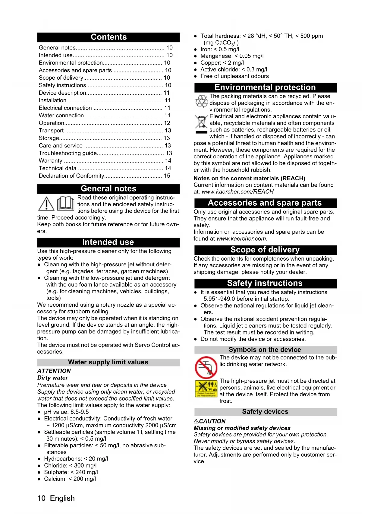 - /l) ● Iron: < 0.5 mg/l ● Manganese: < 0.05 mg/l ● Copper: < 2 mg/l ● Active chloride: < 0.3 mg/l ● Free of unpleasant odours Environmental protection The packing materials can be recycled. Please dispose of packaging in accordance with the en- vironmental regulations. Electrical and electronic appliances contain valu- able, recyclable materials and often components such as batteries, rechargeable batteries or oil, which - if handled or disposed of incorrectly - can pose a potential threat to human health and the environ- ment. However, these components are required for the correct operation of the appliance. Appliances marked by this symbol are not allowed to be disposed of togeth- er with the household rubbish. Notes on the content materials (REACH) Current information on content materials can be found at: www.kaercher.com/REACH Accessories and spare parts Only use original accessories and original spare parts. They ensure that the appliance will run fault-free and safely. Information on accessories and spare parts can be found at www.kaercher.com. Scope of delivery Check the contents for completeness when unpacking. If any accessories are missing or in the event of any shipping damage, please notify your dealer. Safety instructions ● It is essential that you read the safety instructions 5.951-949.0 before initial startup. ● Observe the national regulations for liquid jet clean- ers. ● Observe the national accident prevention regula- tions. Liquid jet cleaners must be tested regularly. The test result must be recorded in writing. ● Do not modify the device or accessories. Symbols on the device The device may not be connected to the pub- lic drinking water network. The high-pressure jet must not be directed at persons, animals, live electrical equipment or at the device itself. Protect the device from frost. Safety devices 몇 CAUTION Missing or modified safety devices Safety devices are provided for your own protection. Never modify or bypass safety devices. The safety devices are set and sealed by the manufac- turer. Adjustments are performed only by customer ser- vice. General notes p. 10